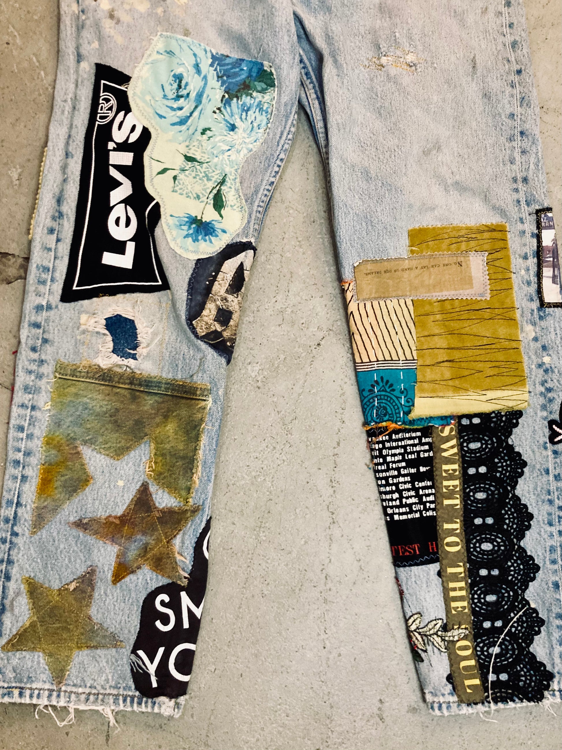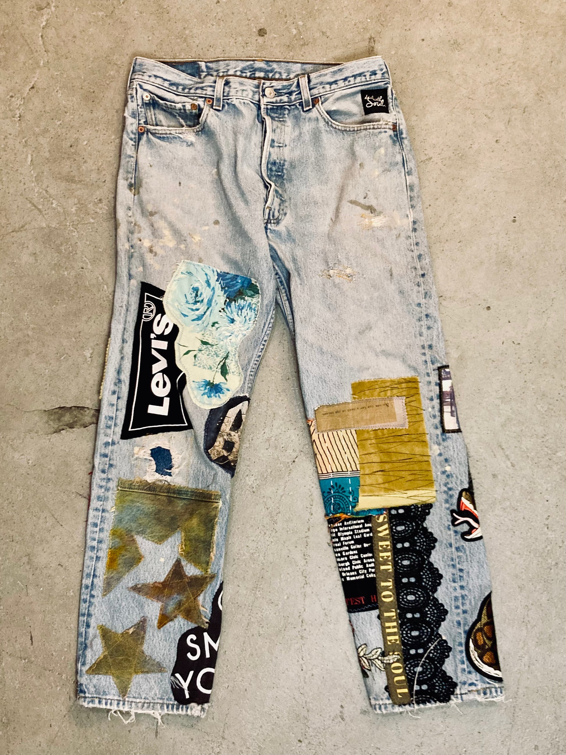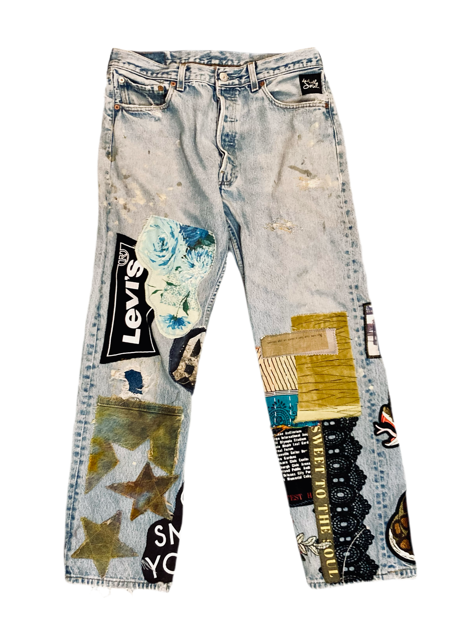 Uniquely distressed paint stains and/or frayed edges galore. One of a kind & unique. Shop mindfully as all sales are final