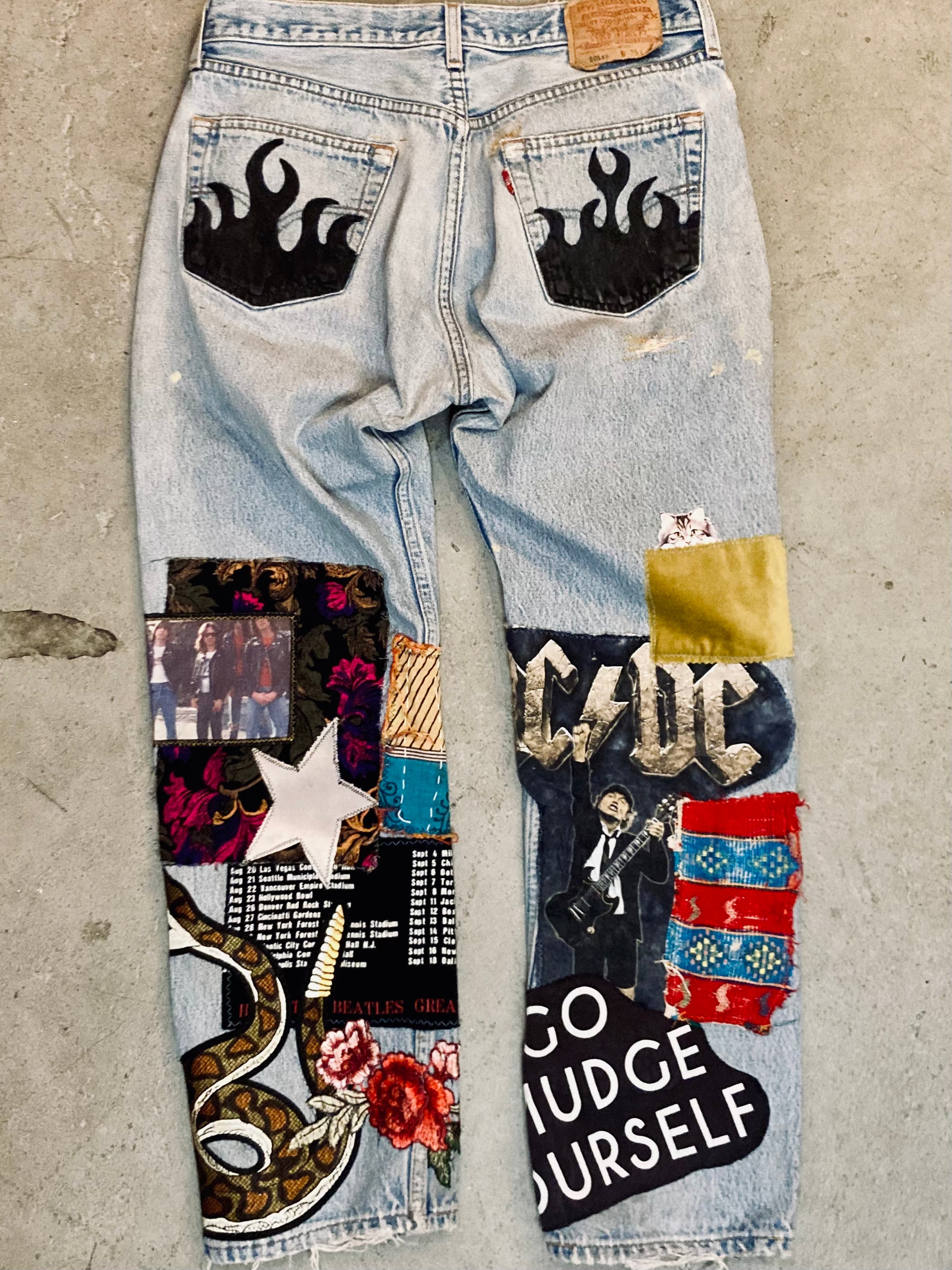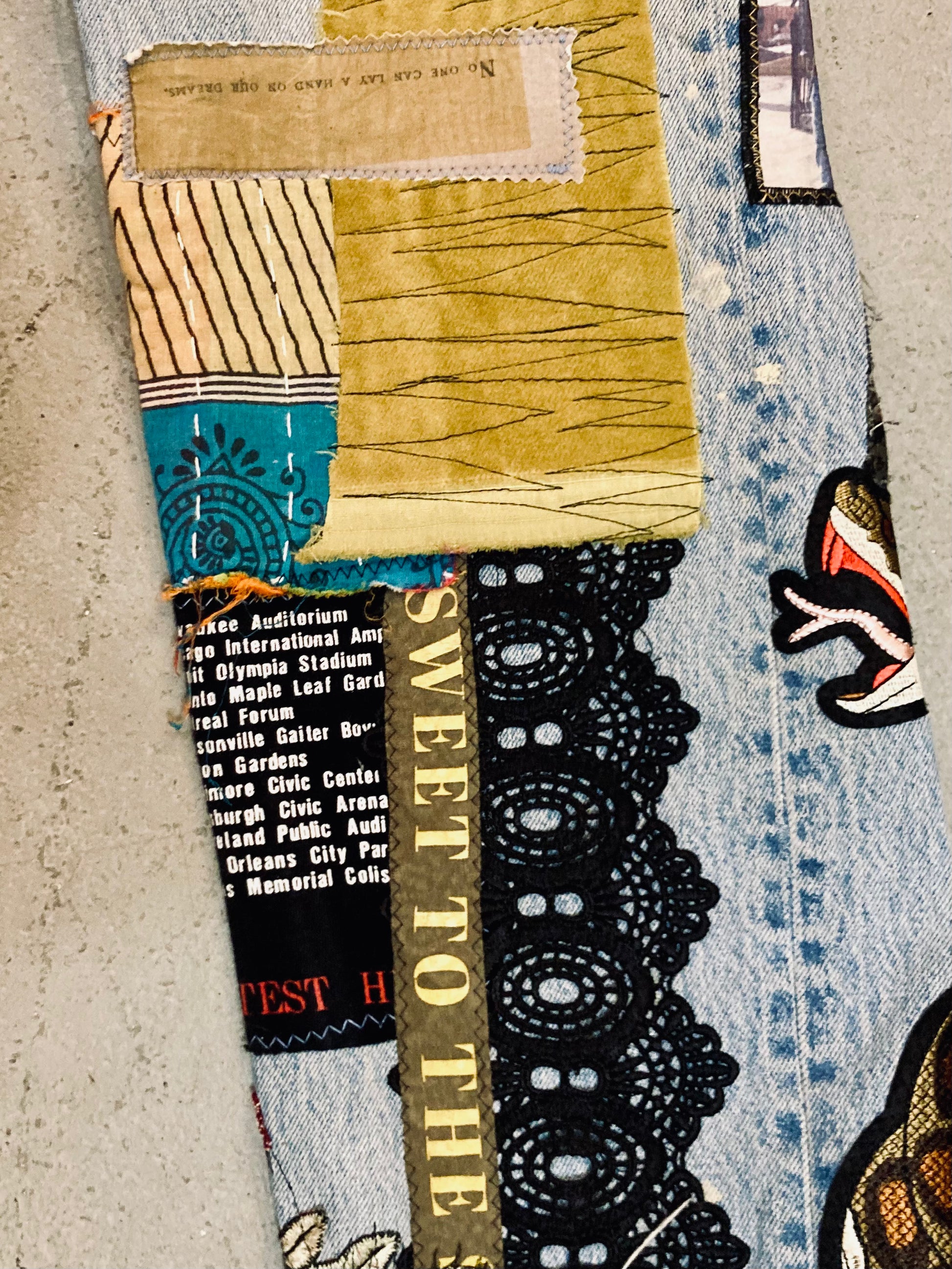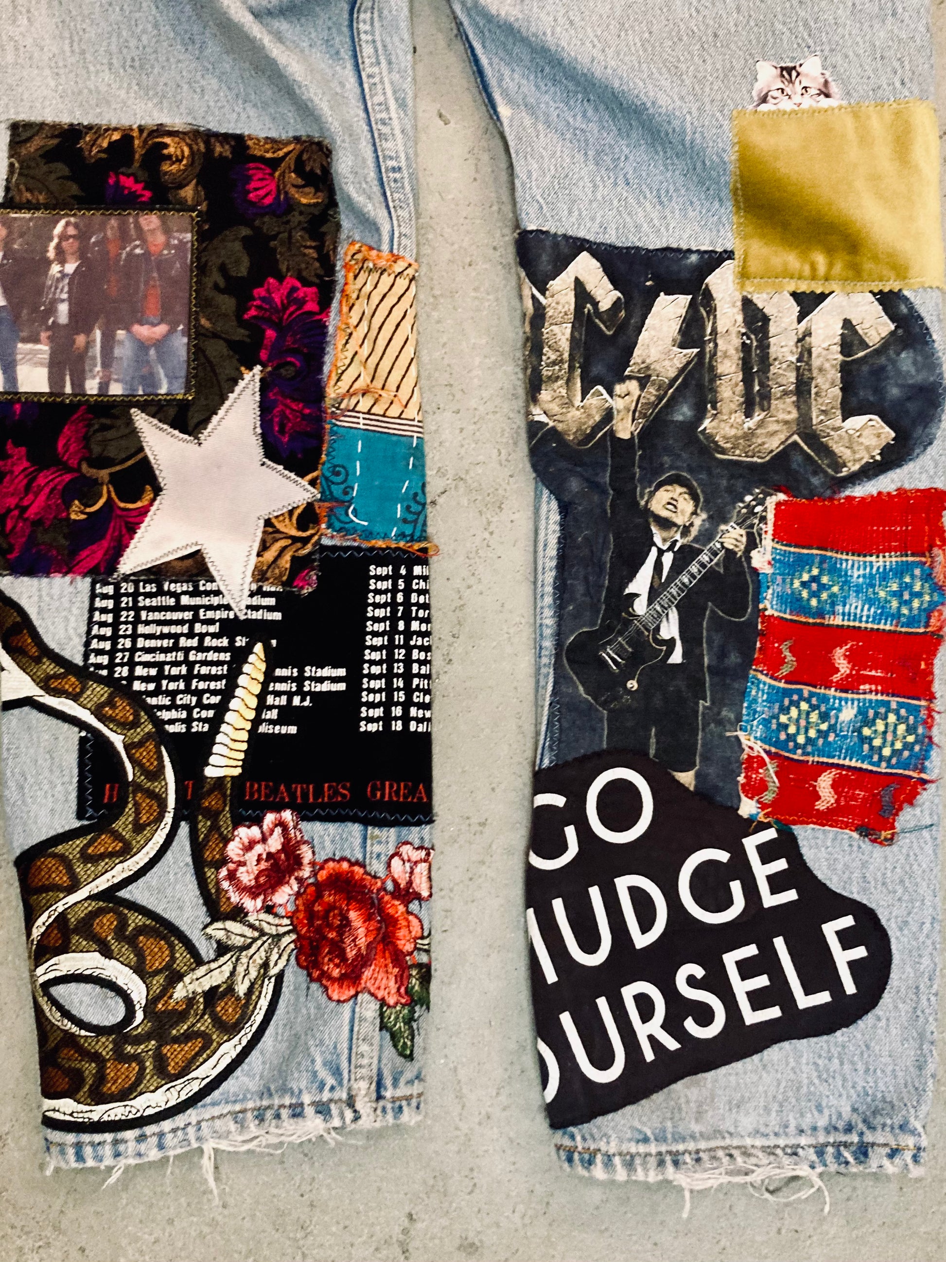 Uniquely distressed paint stains and/or frayed edges galore. One of a kind & unique. Shop mindfully as all sales are final