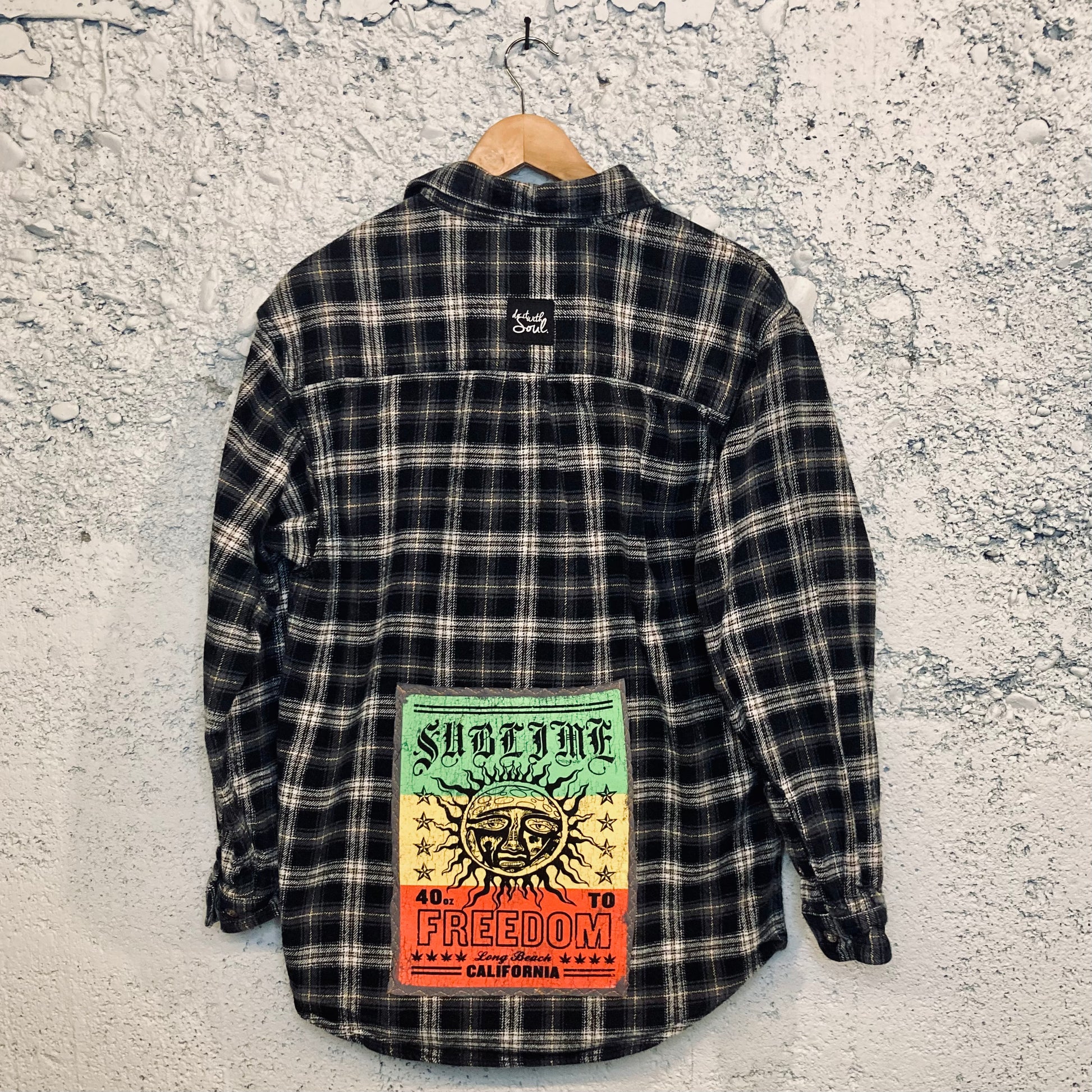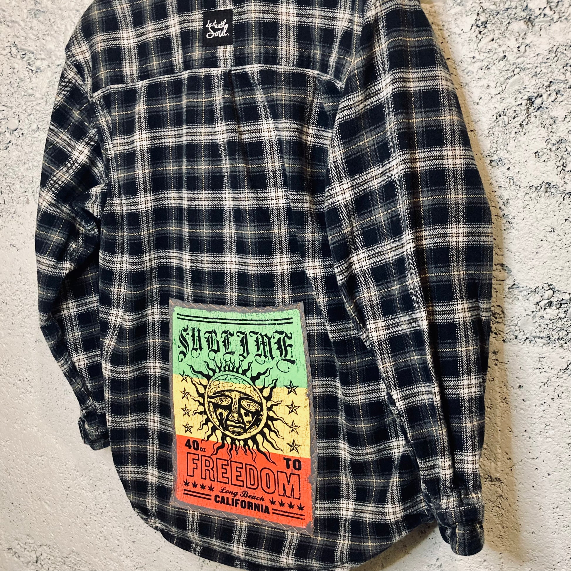 Heavy weight, durable cotton blend flannel with indigo blue/gray and white colors. Perfect for bonfires. One of a kind.