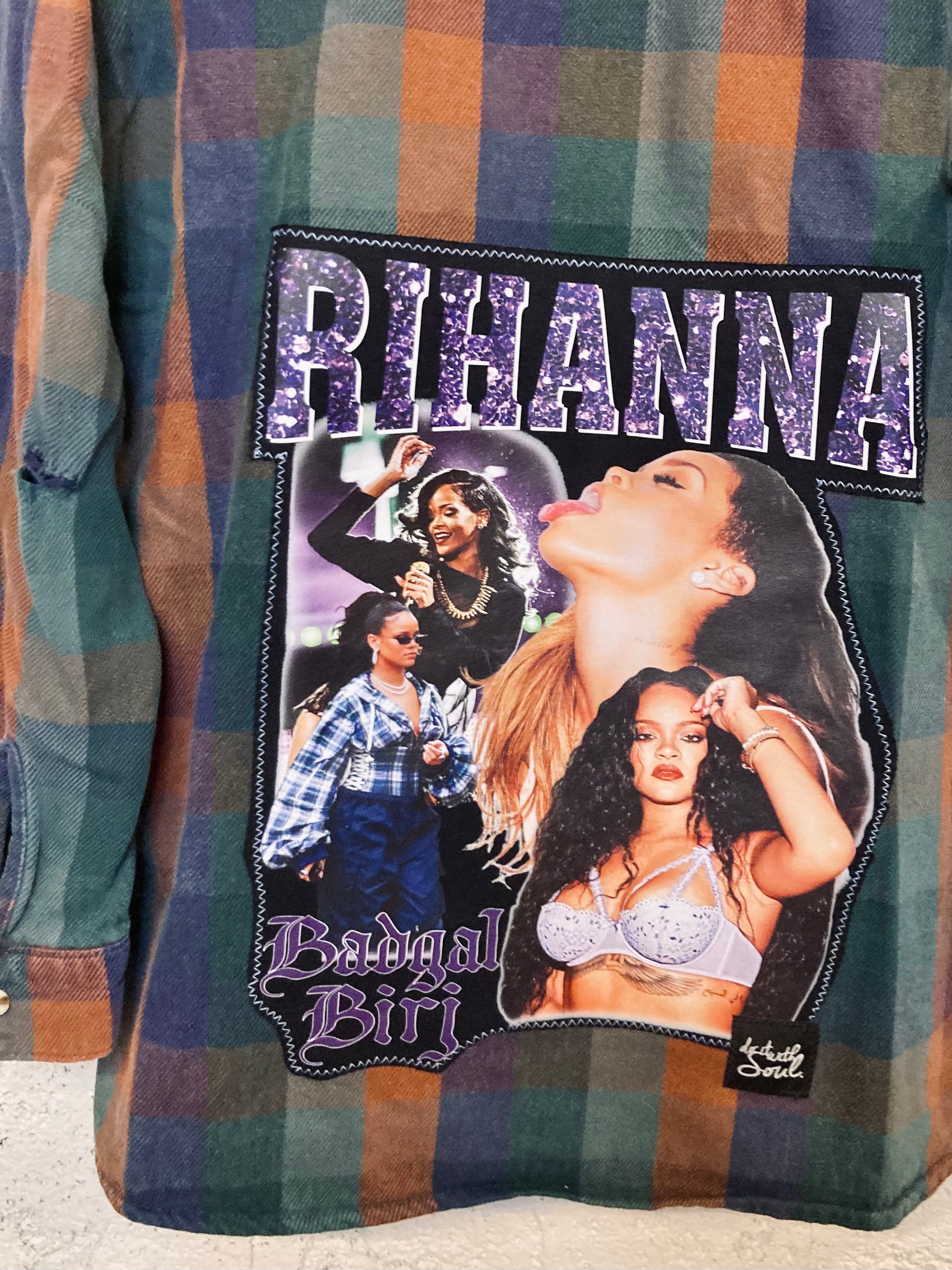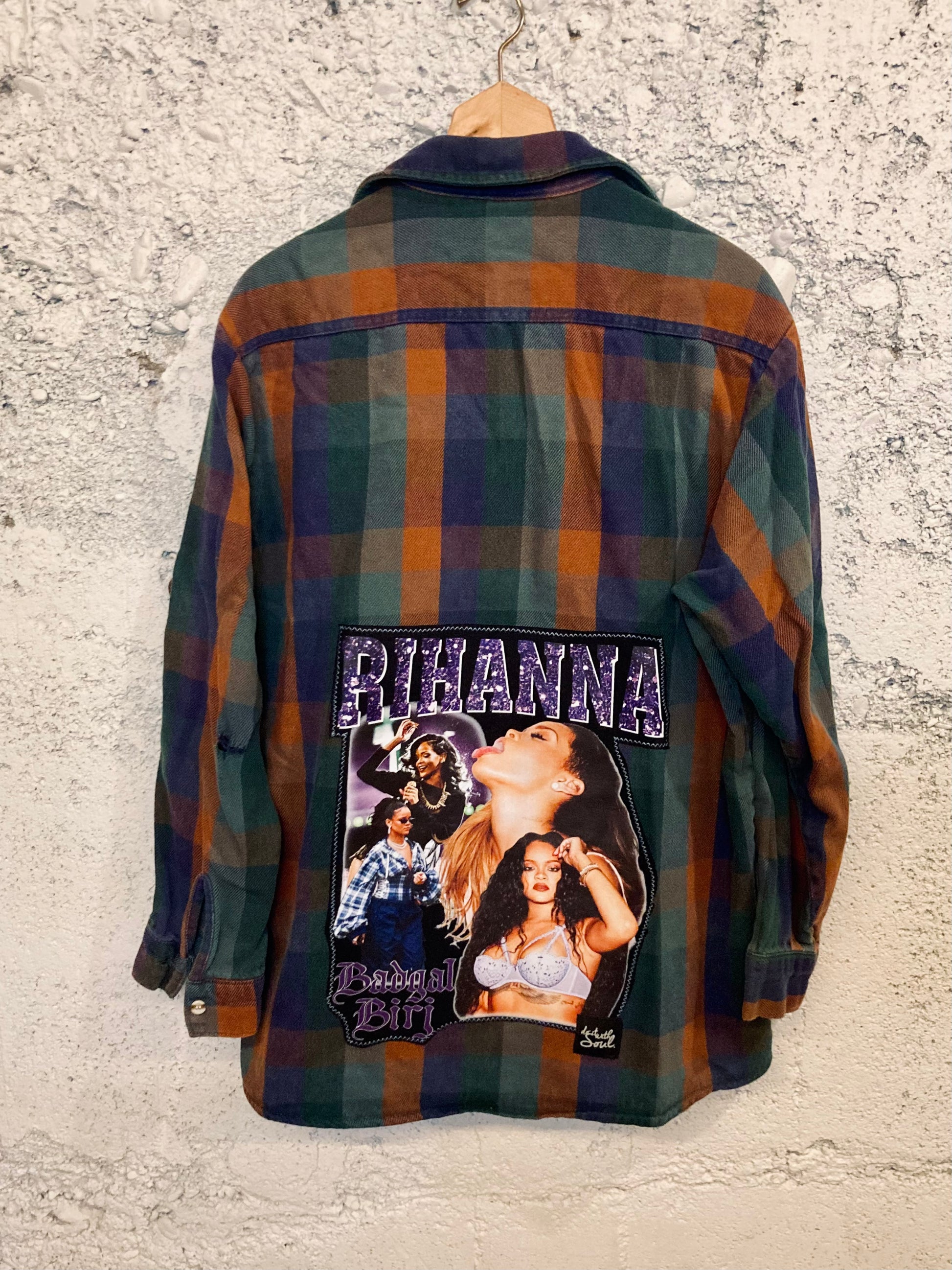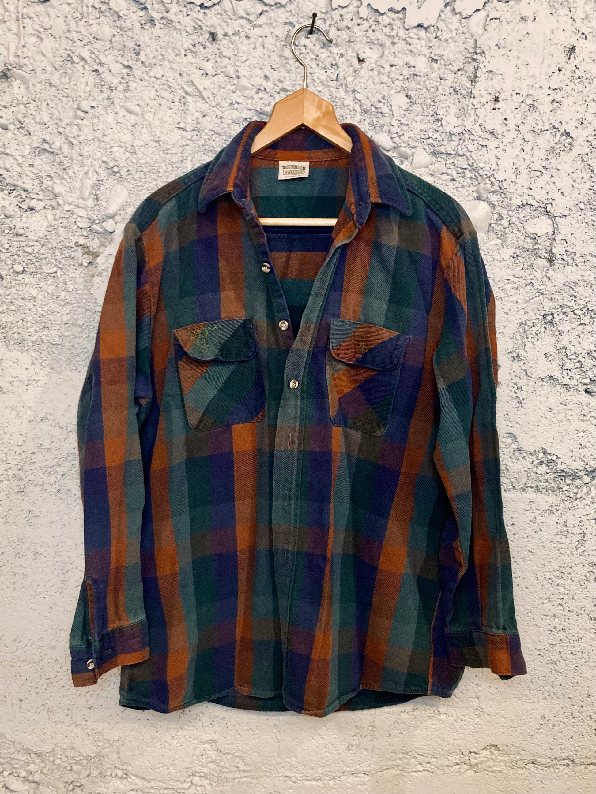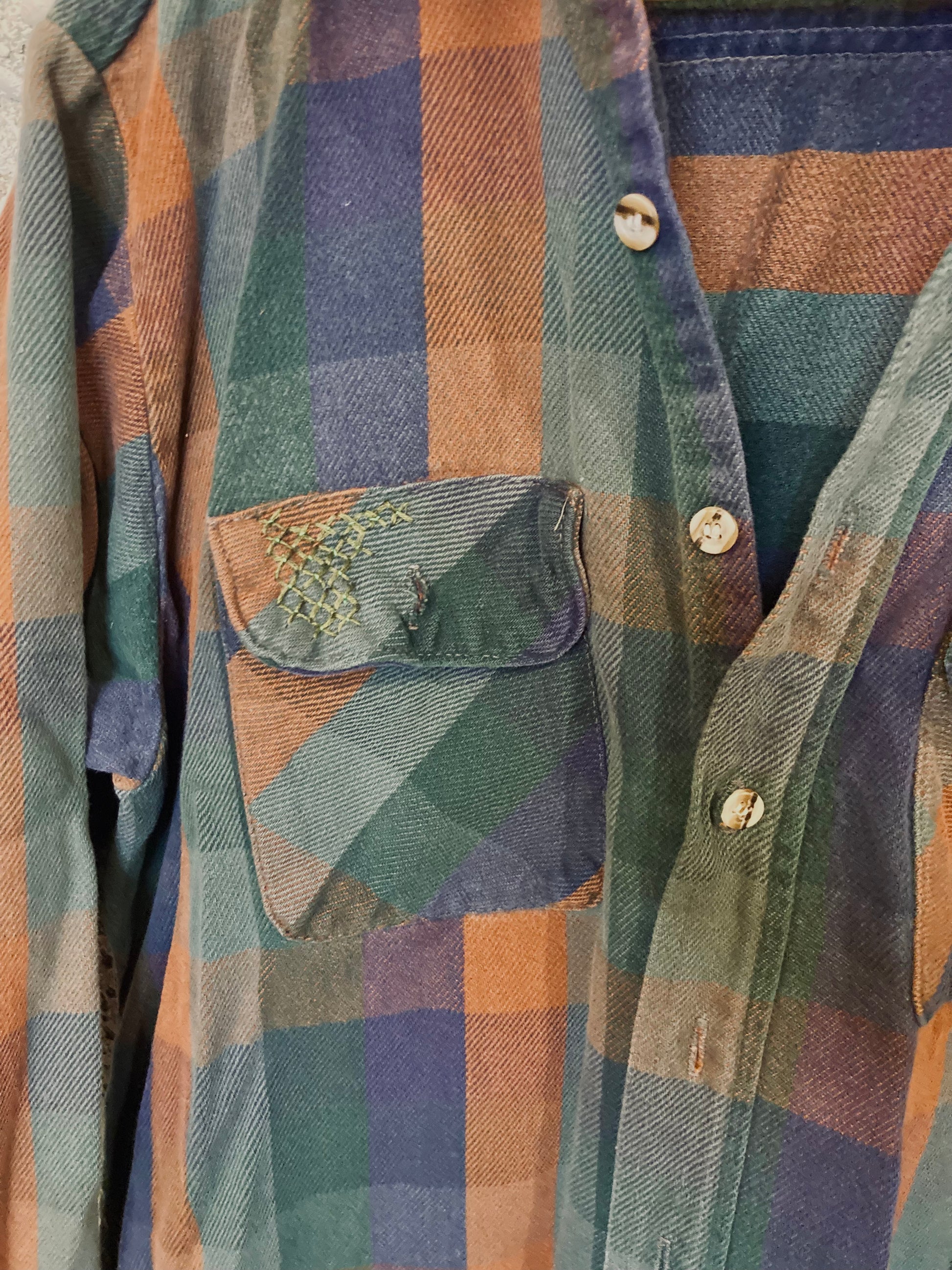 Upcycled medium weight, durable cotton flannel with blue, green and rust colors. Perfect for bonfires. One of a kind.