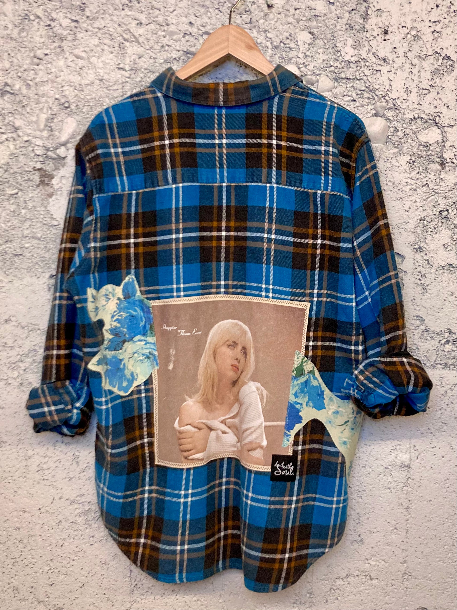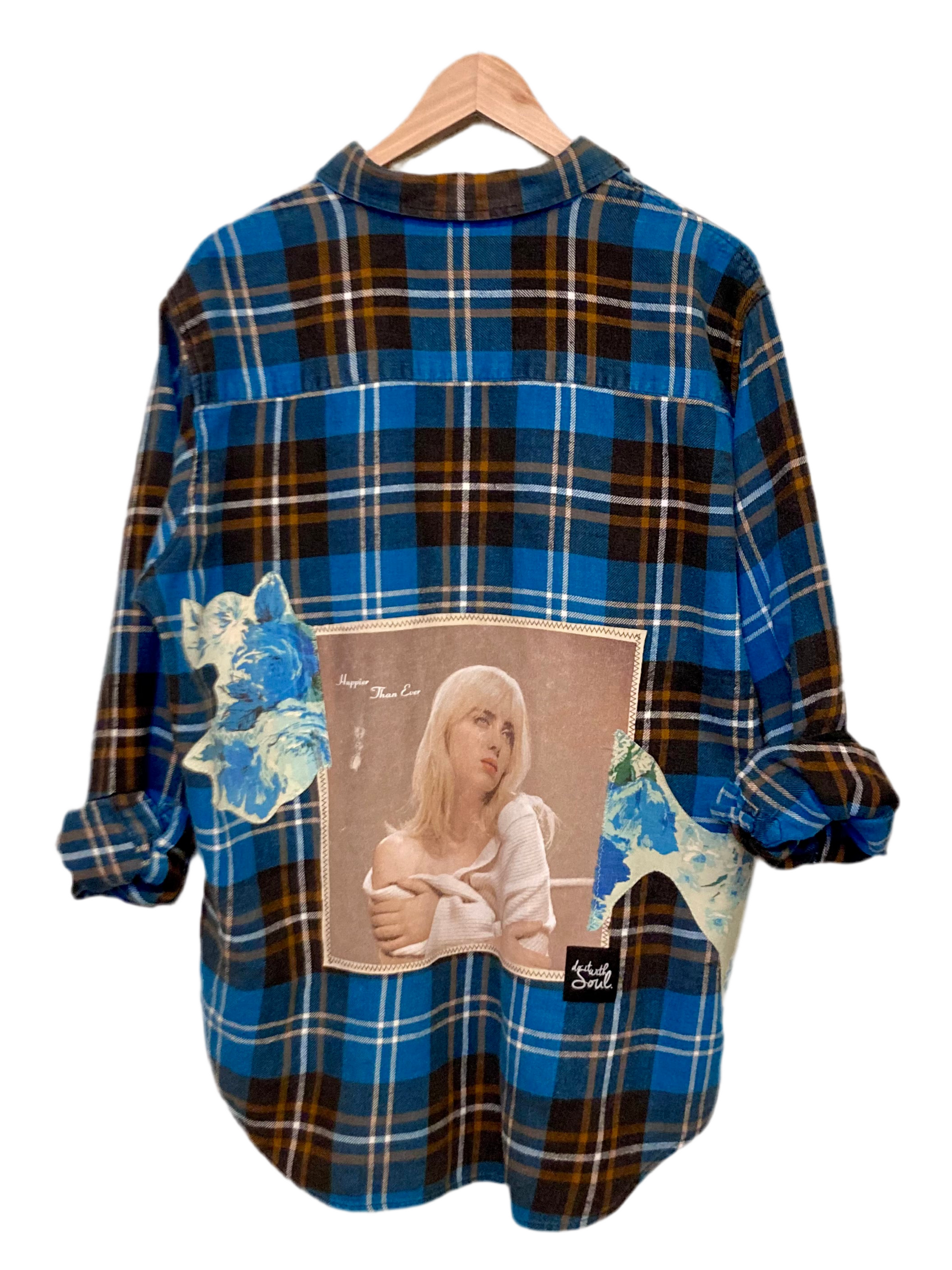 This one of a kind flannel is a must-have for any Billie Eilish fan. Its vintage floral fabric patches add a touch of old Hollywood to this flannel.
