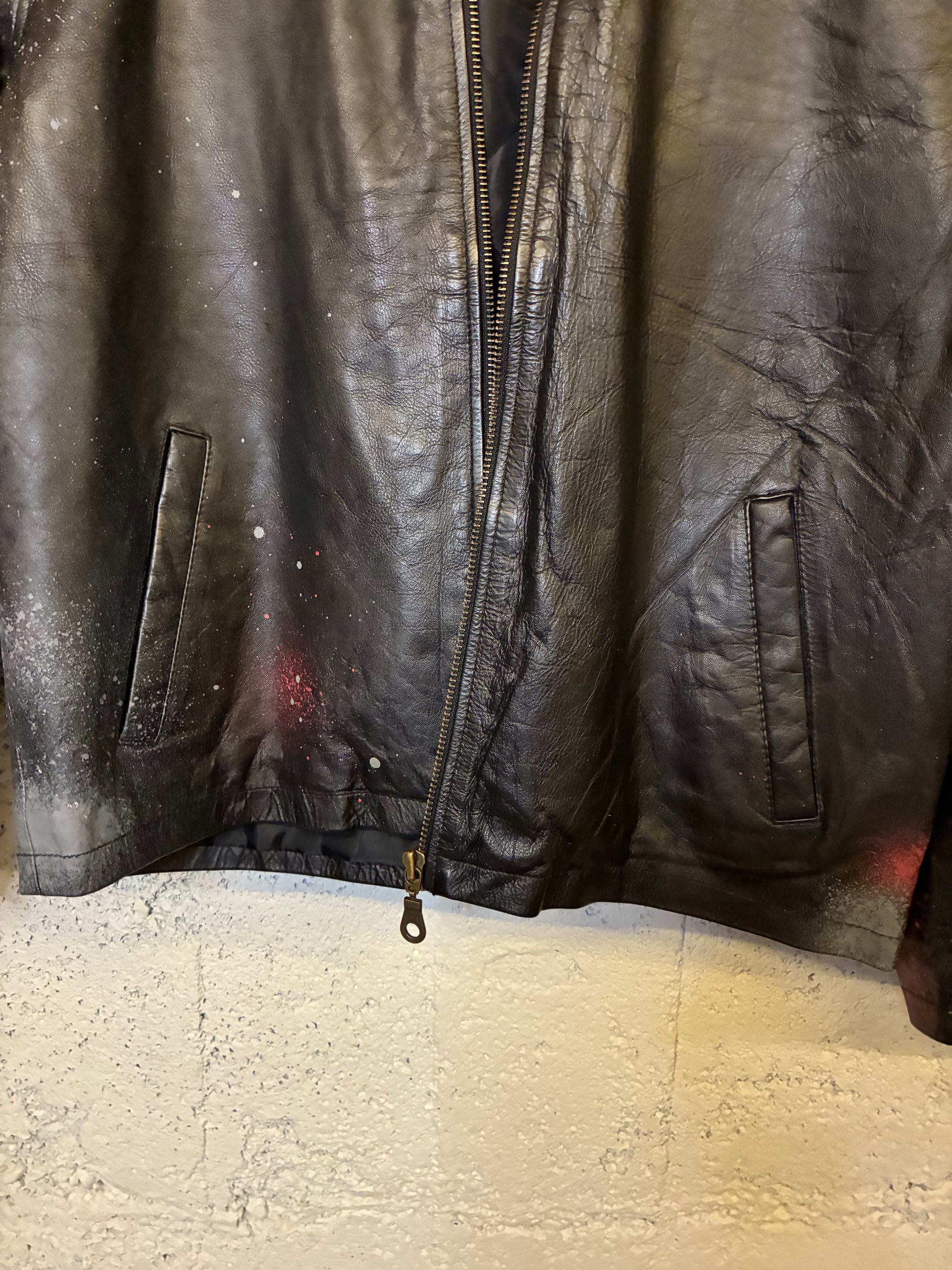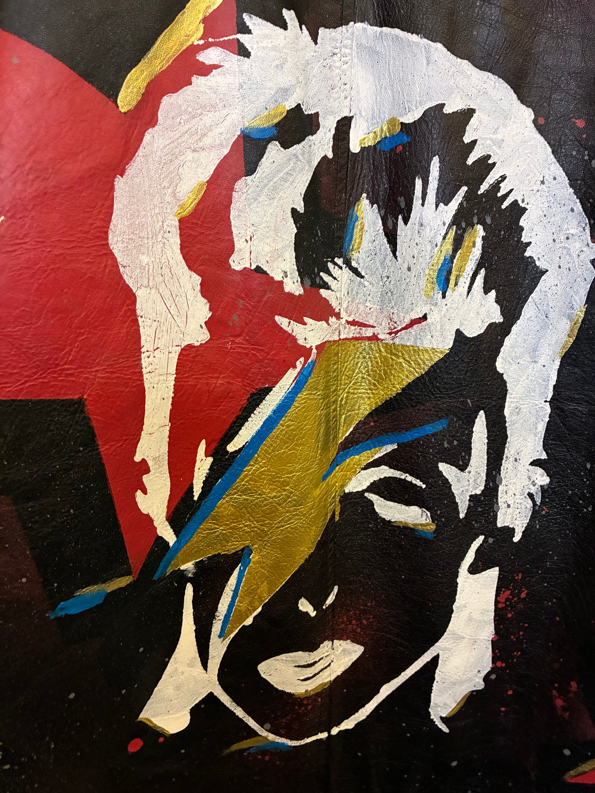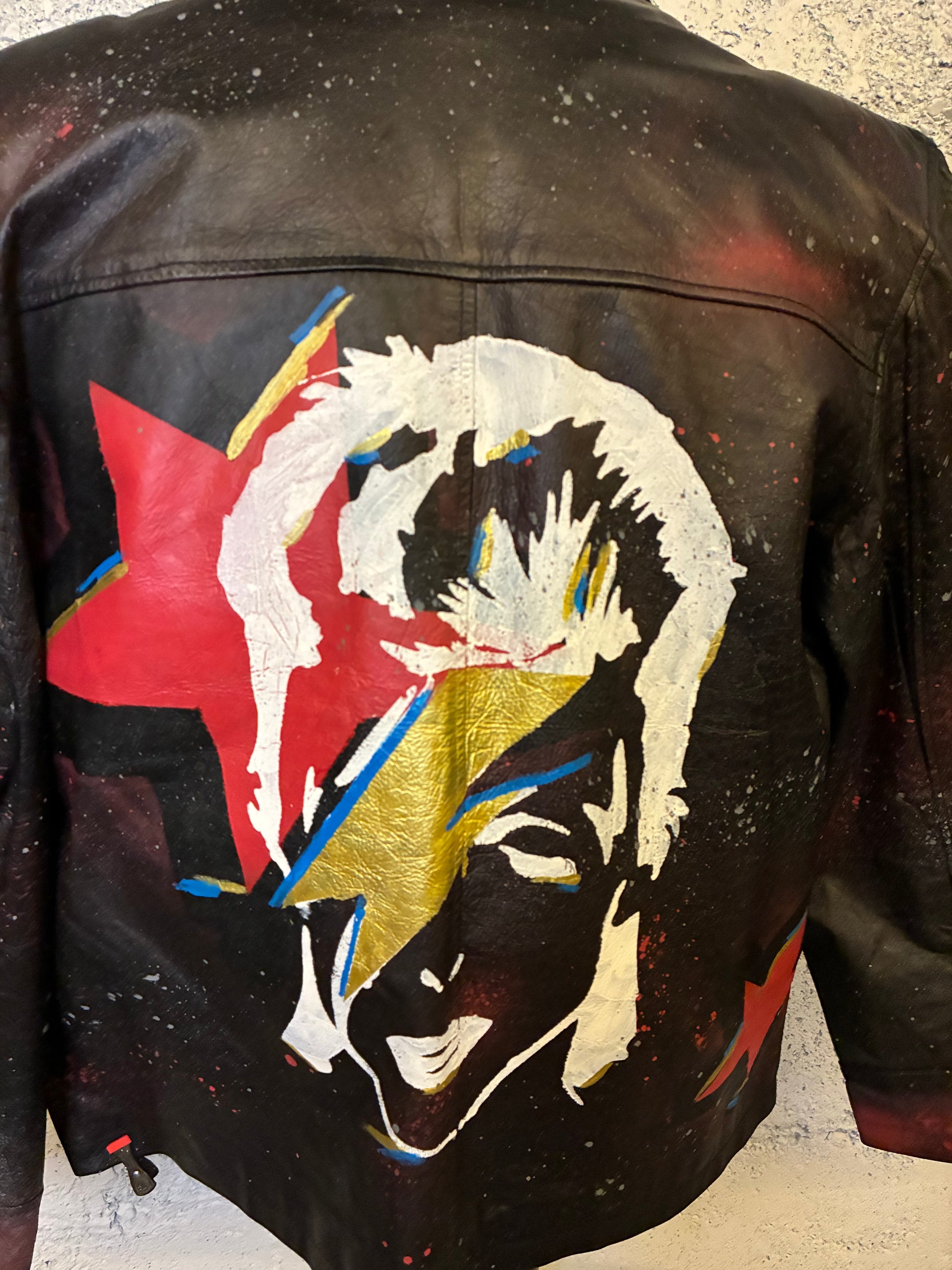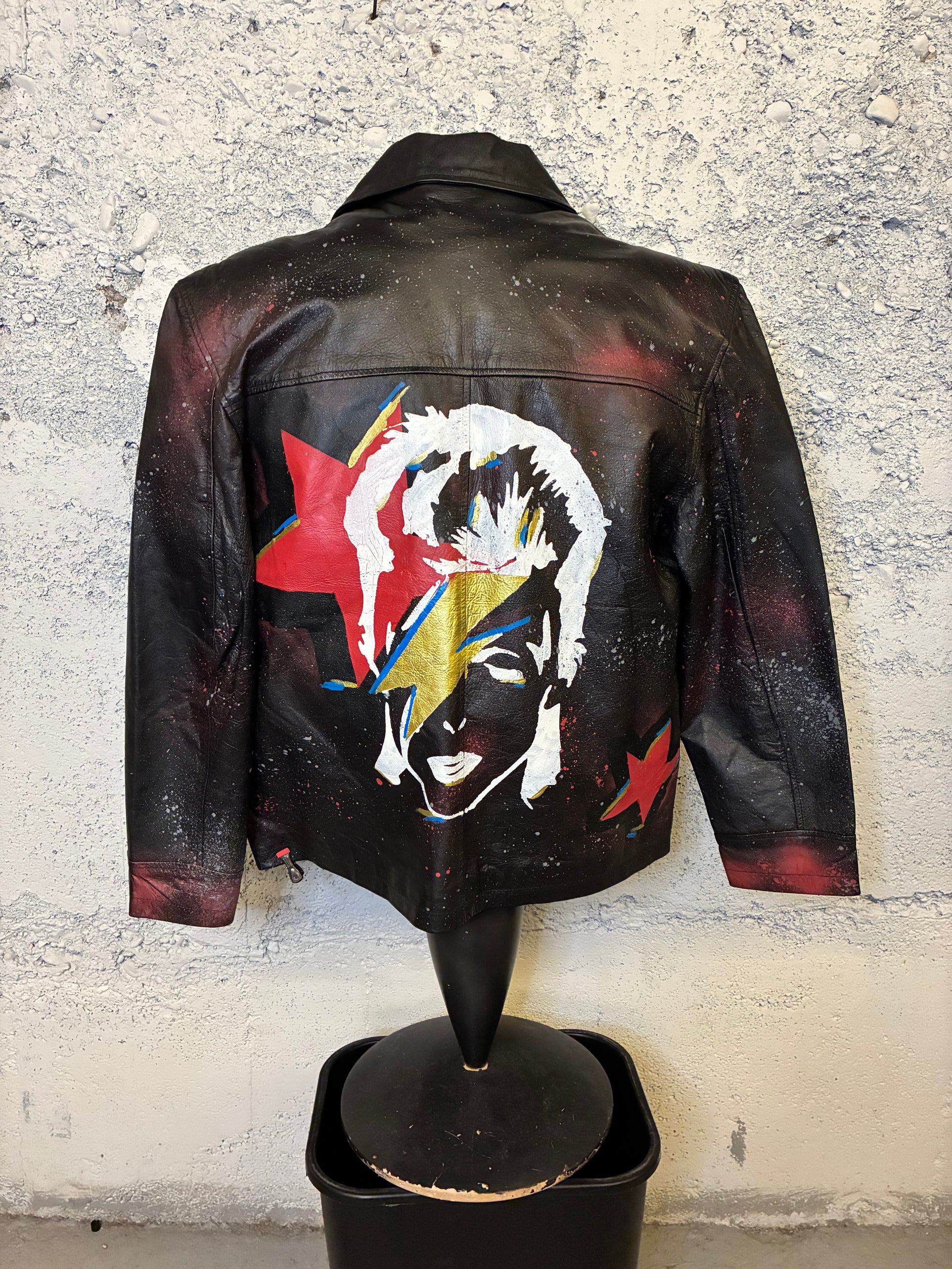 Get ready for a unique vintage look with the Bowie Jacket. Featuring hand painted high quality plastisol ink, this 80s deadstock jacket will make you stand out in any crowd. Add a touch of retro style to your wardrobe with this one-of-a-kind piece.