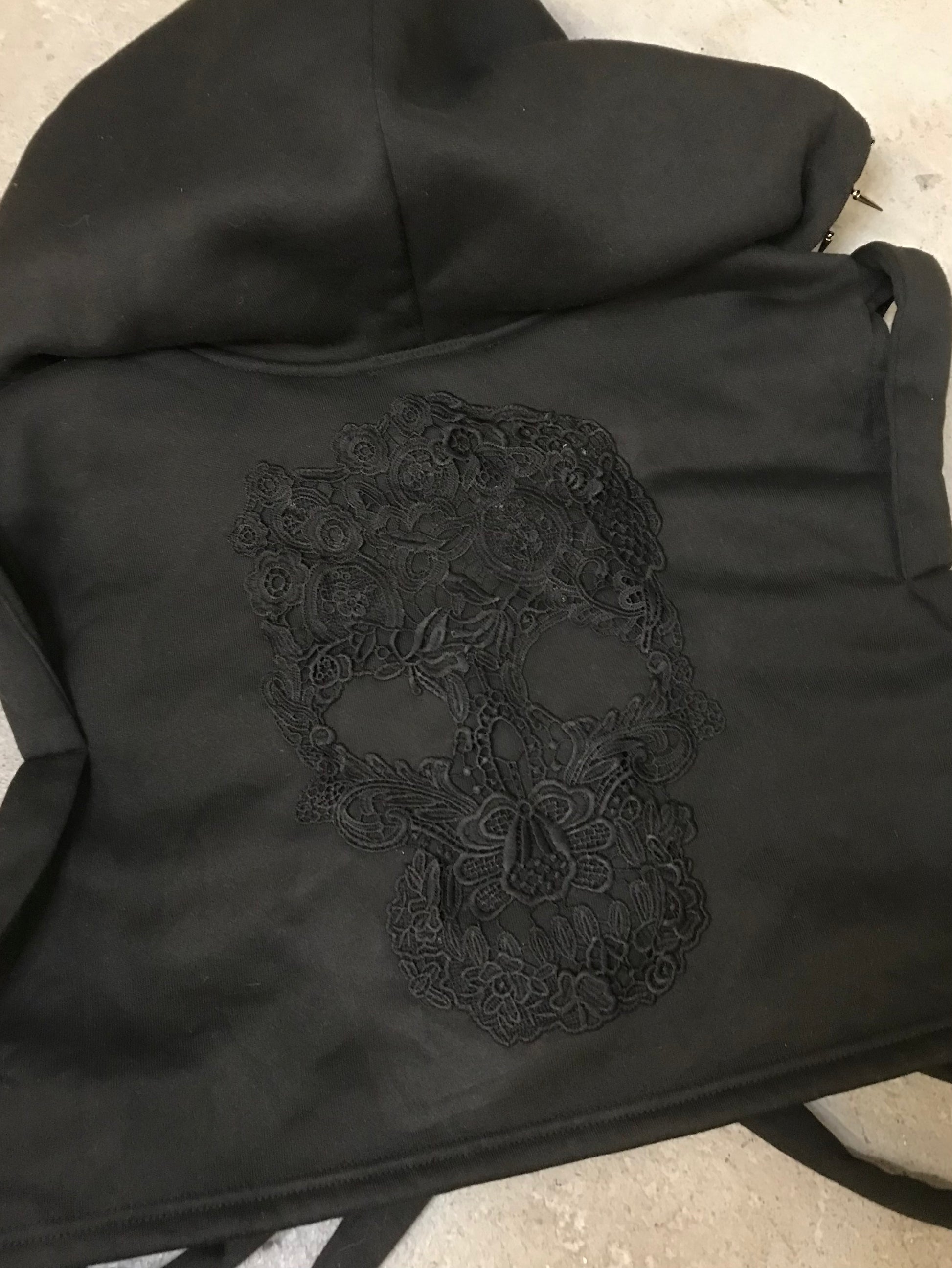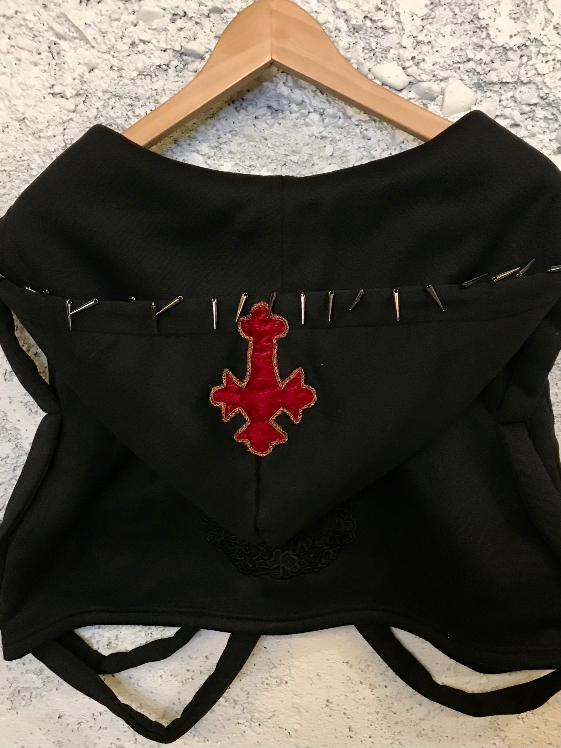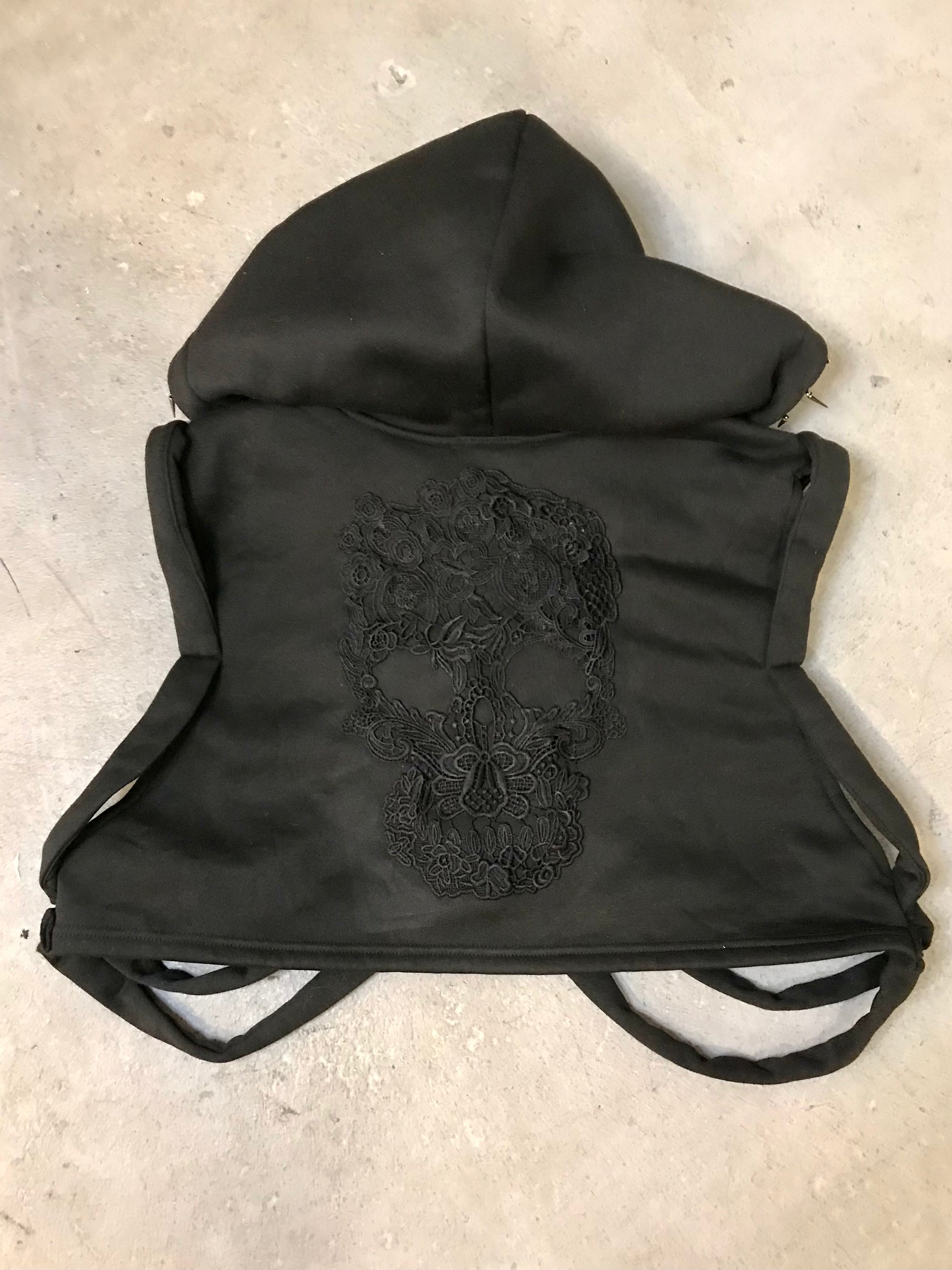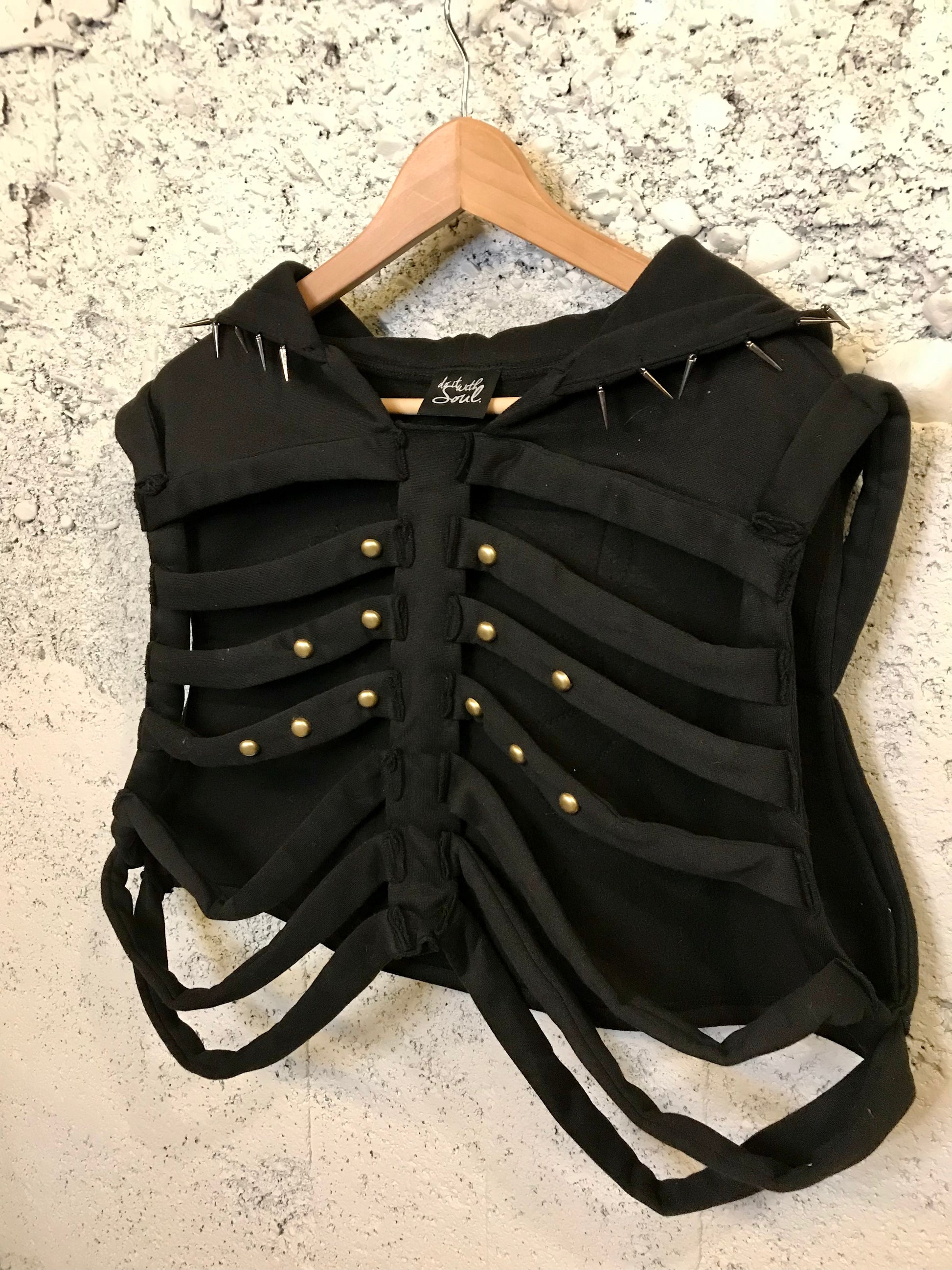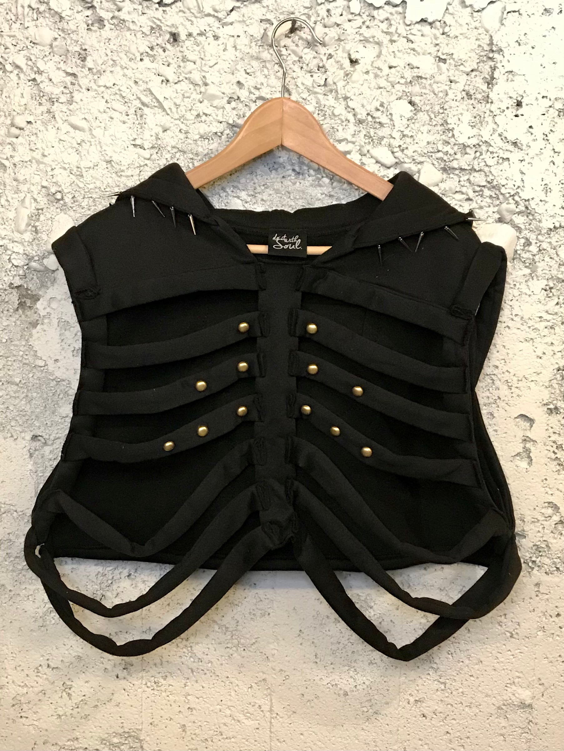 Go beyond the norm with our Caged No.01, a custom knit ribcage hooded top featuring bras studs on the front and a crocheted skull on the back. The hood is accented with spikes and a vintage velvet appliqué, adding an edgy touch to your wardrobe. Stand out and take risks in our statement top!