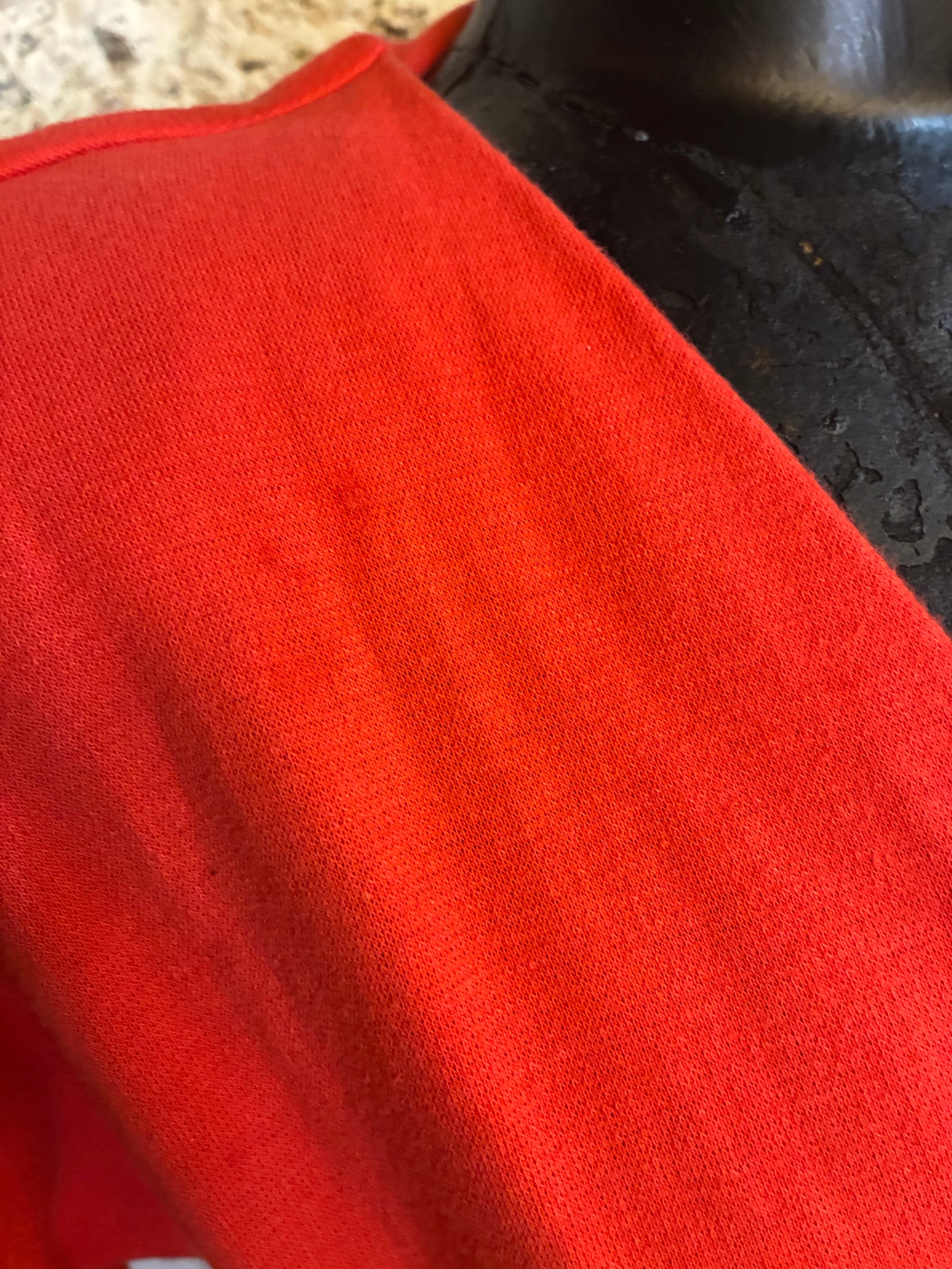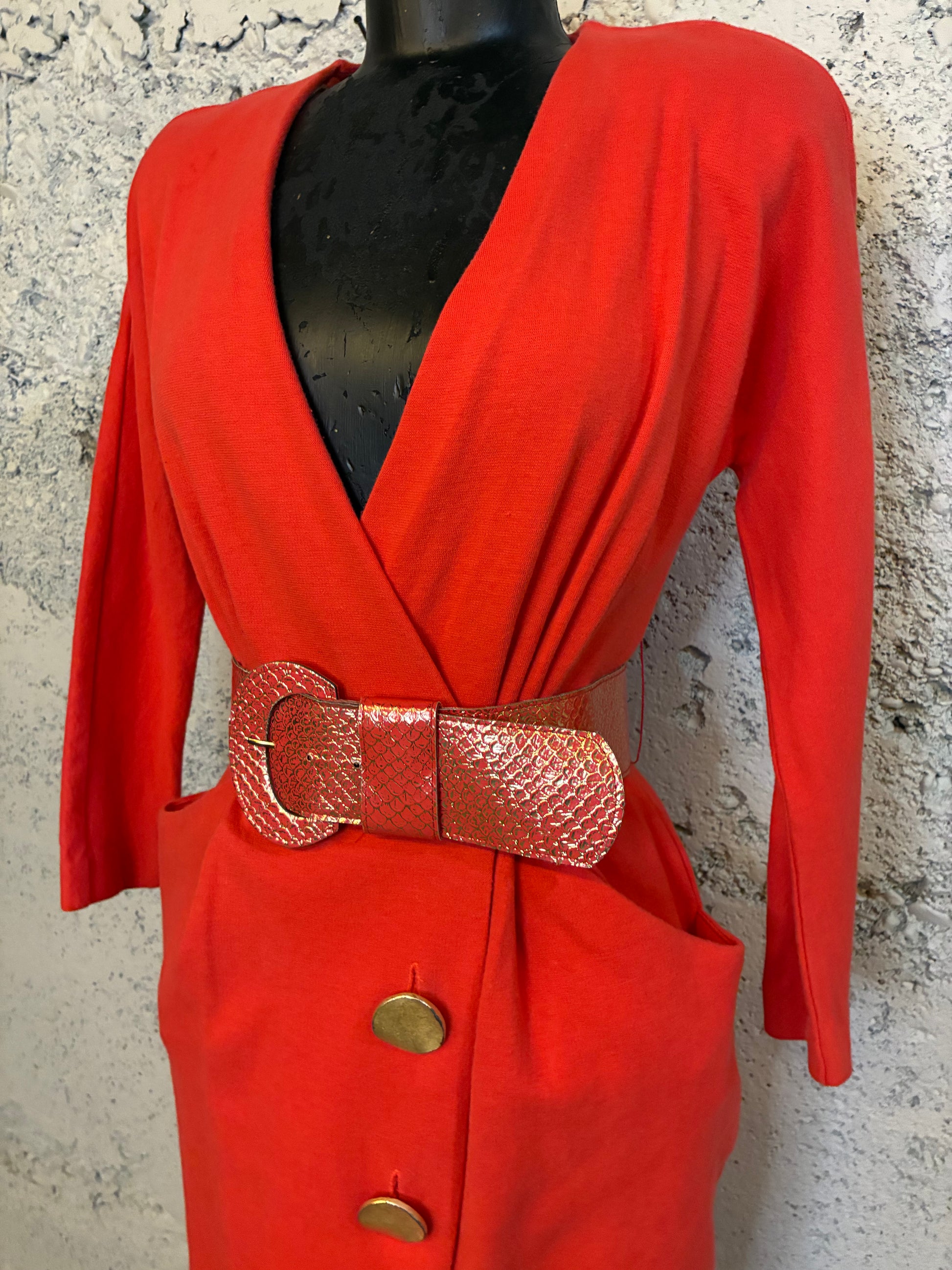 This elegant orange knit wrap dress features a stylish belt and button with gold accents. Perfect for any occasion, it offers a flattering fit and timeless style.