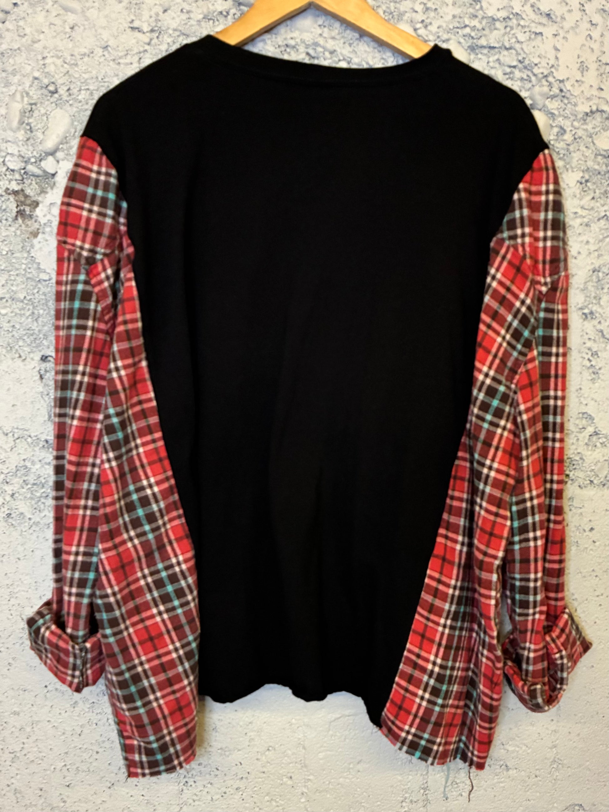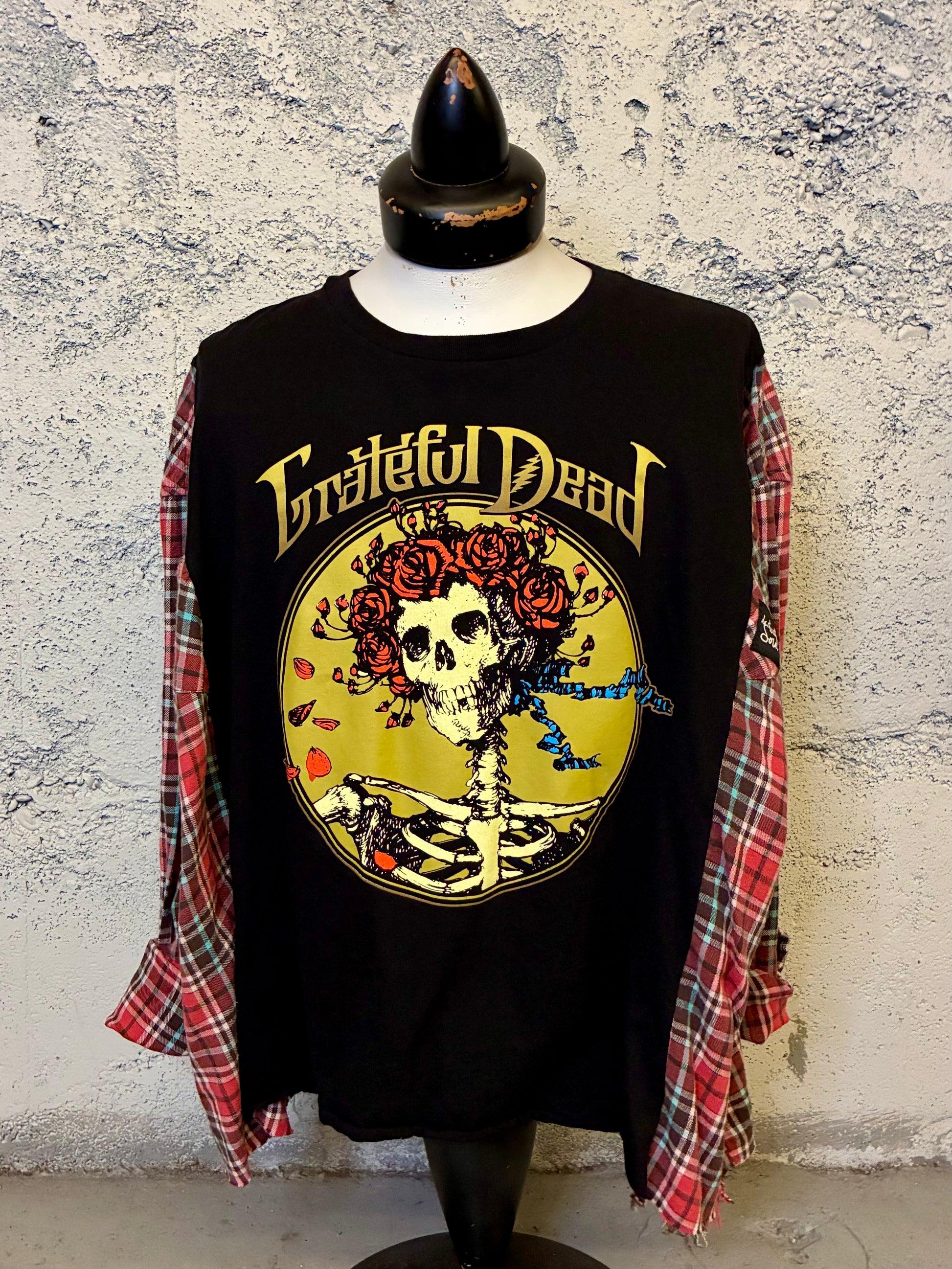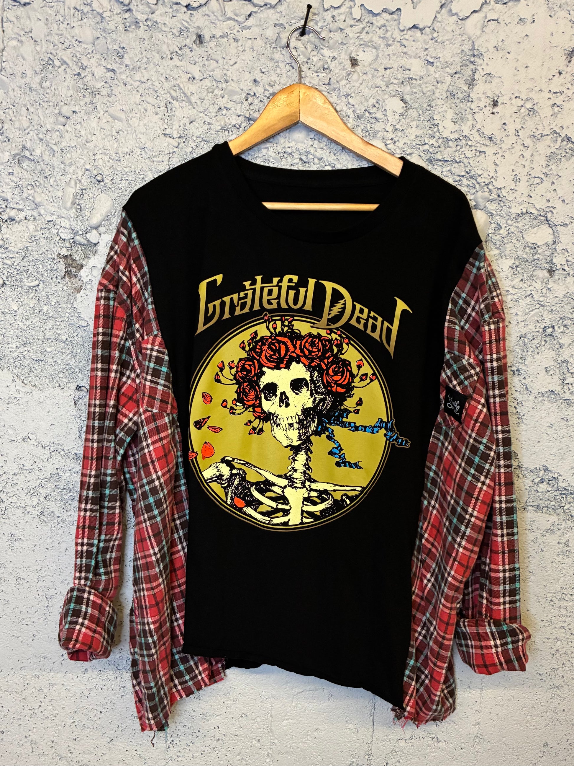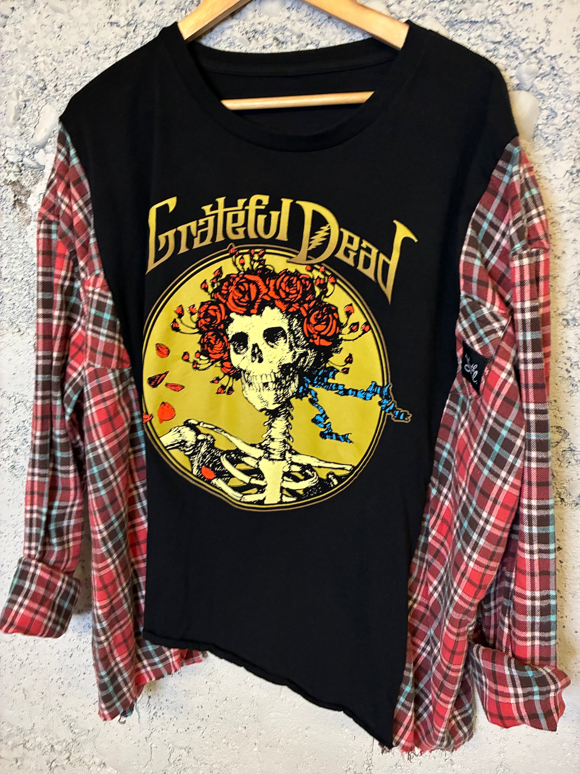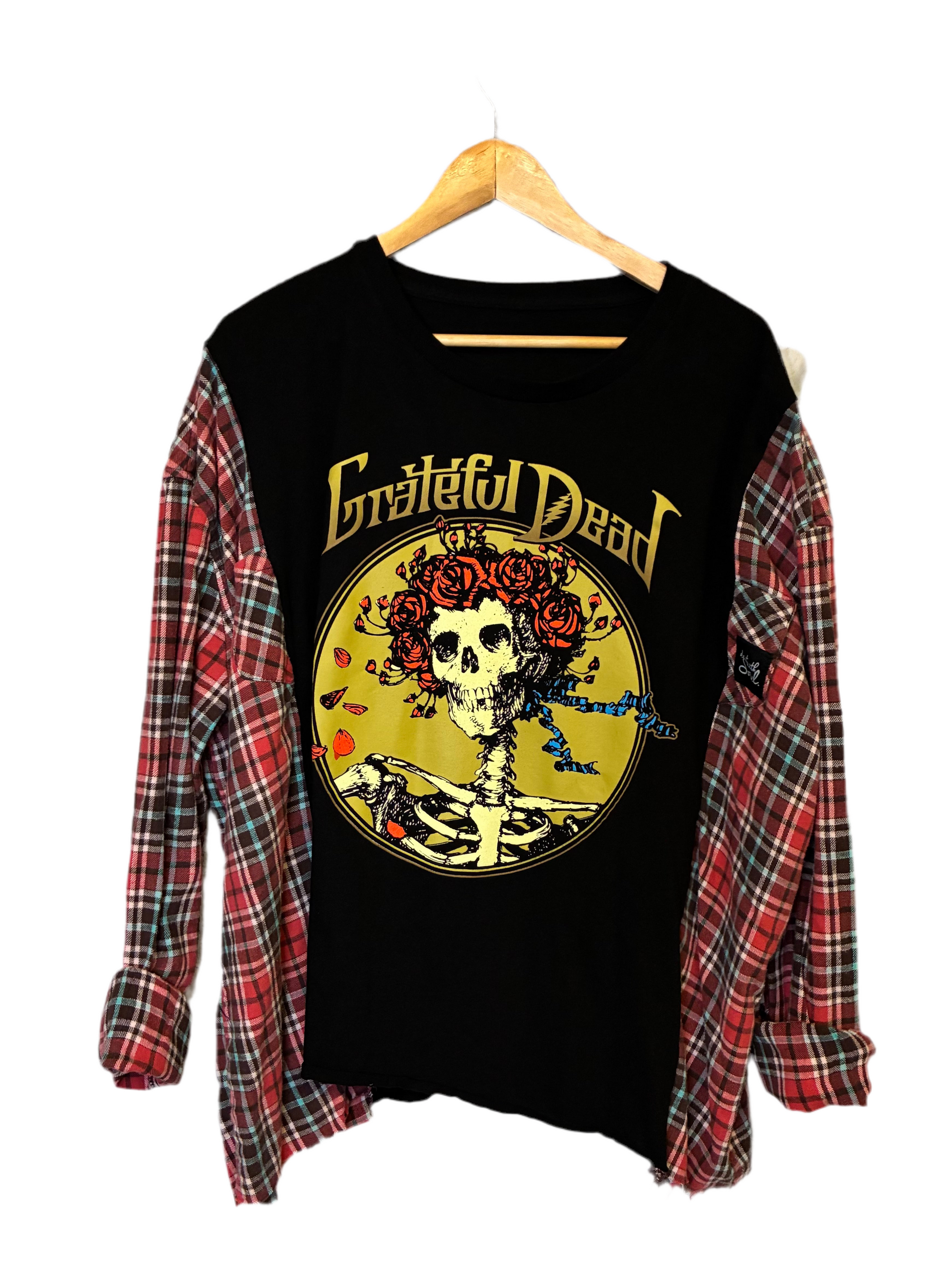 Multi-coloured Grateful Dead tee shirt re-worked with a flannel. One piece