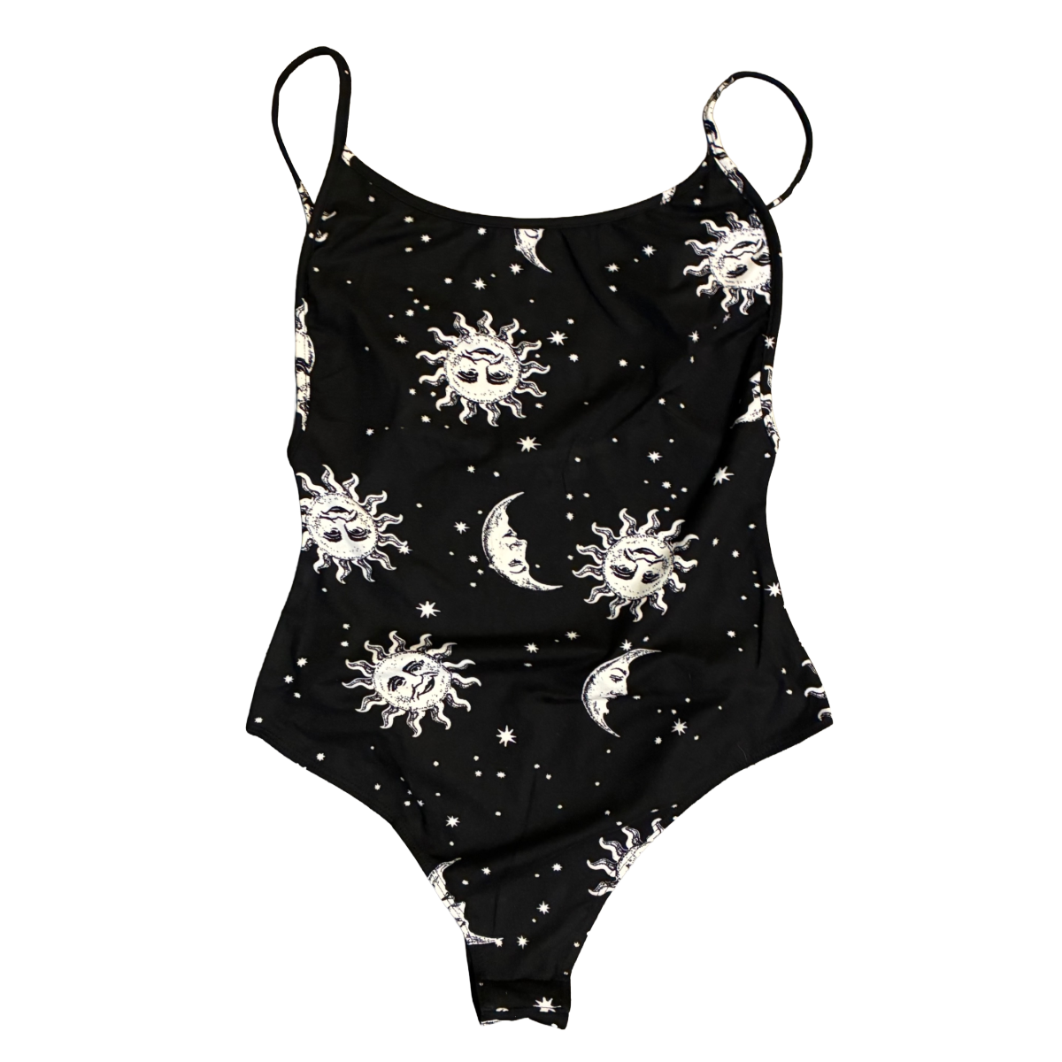 Get in touch with the celestial energy with our Midnights Bodysuit. Featuring a black and white print, adjustable straps, and sun and moon vibes. Comfortable and stylish, channel your inner star with this piece.