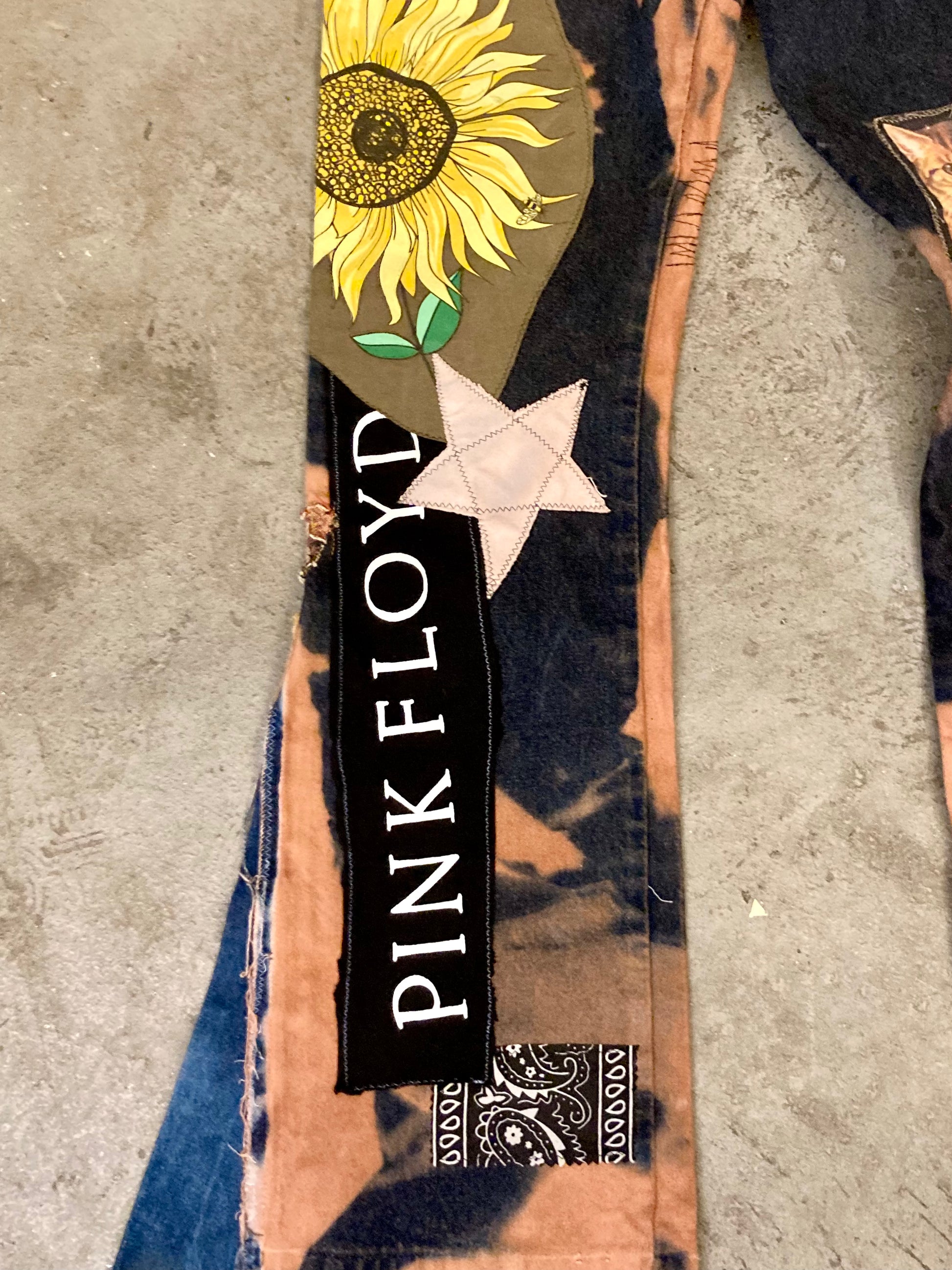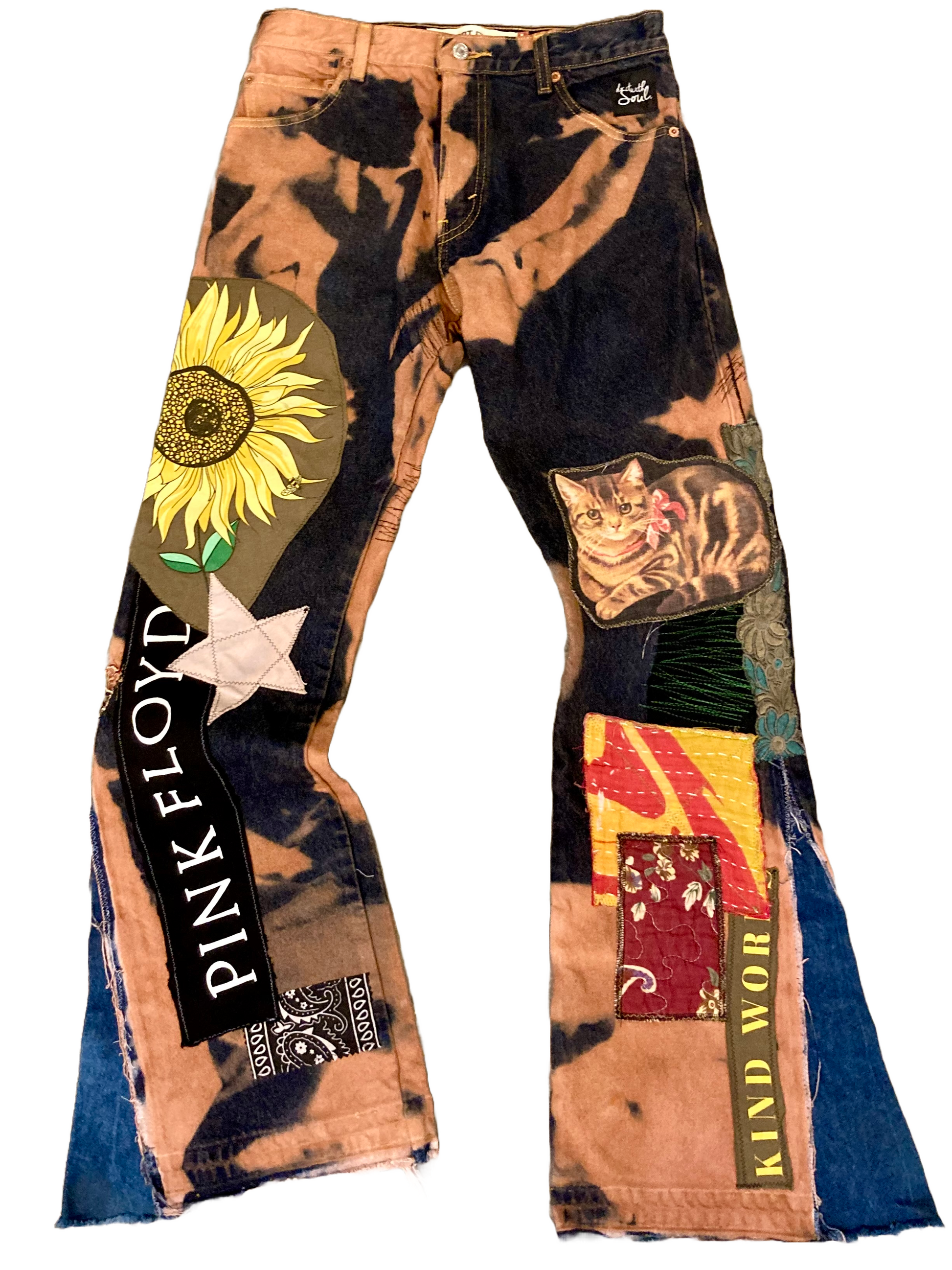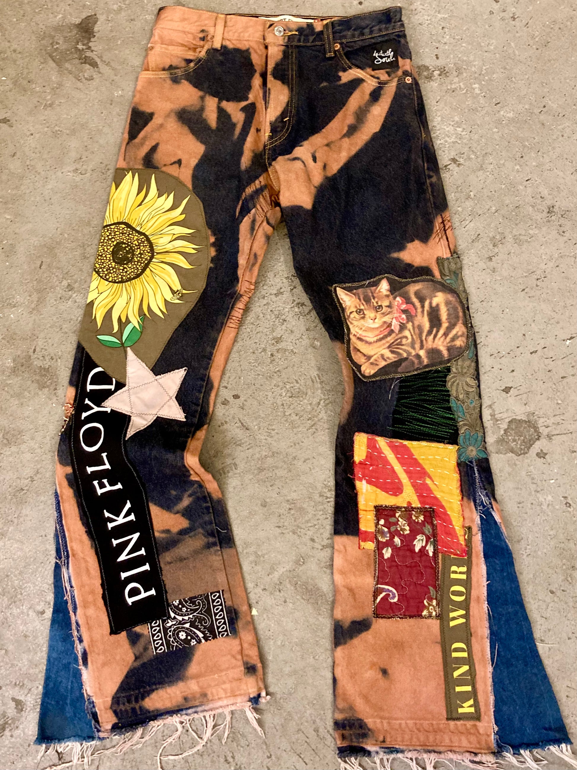 Custom tie dye effect, various patches, additional flared insert. One of One