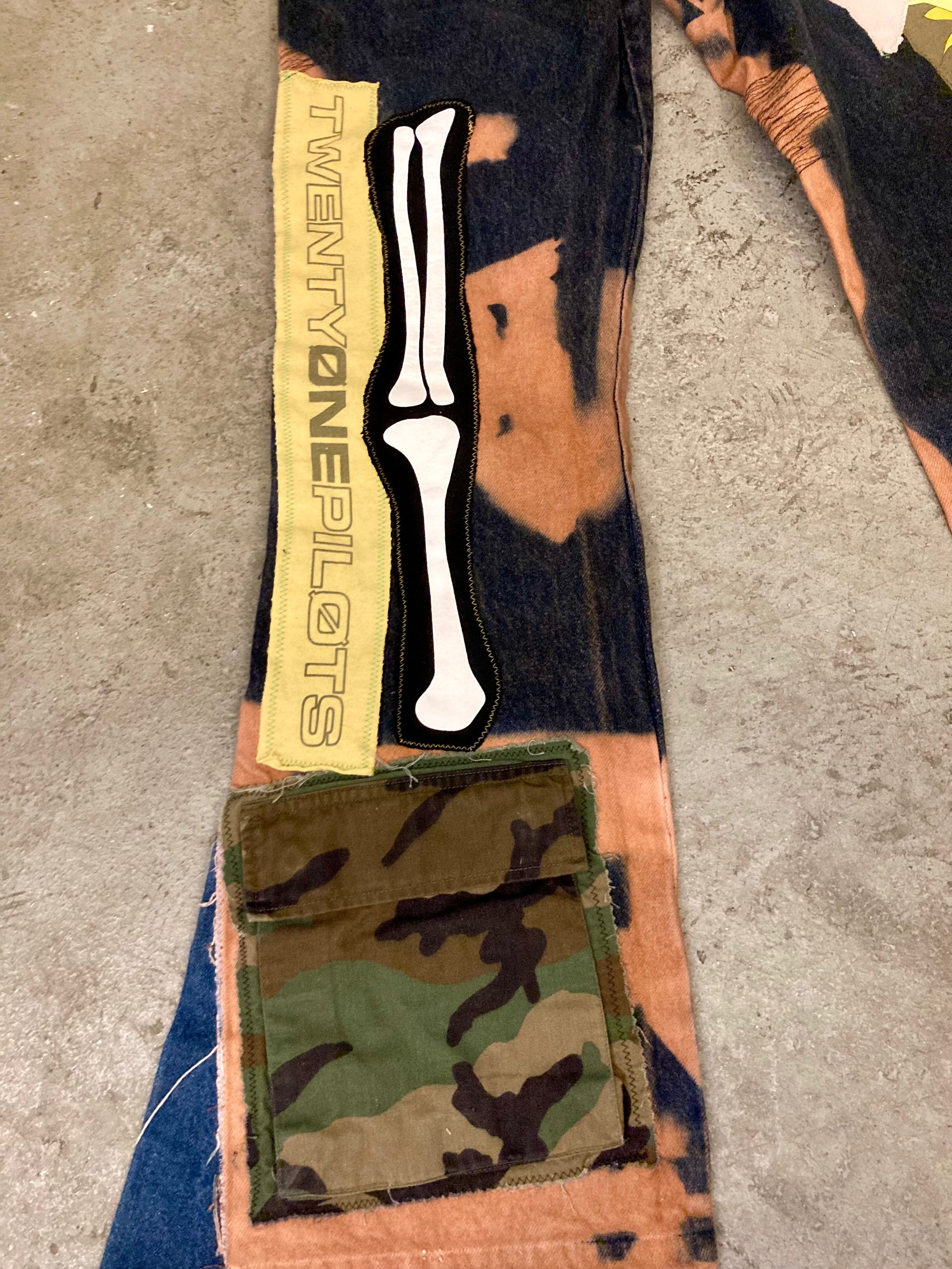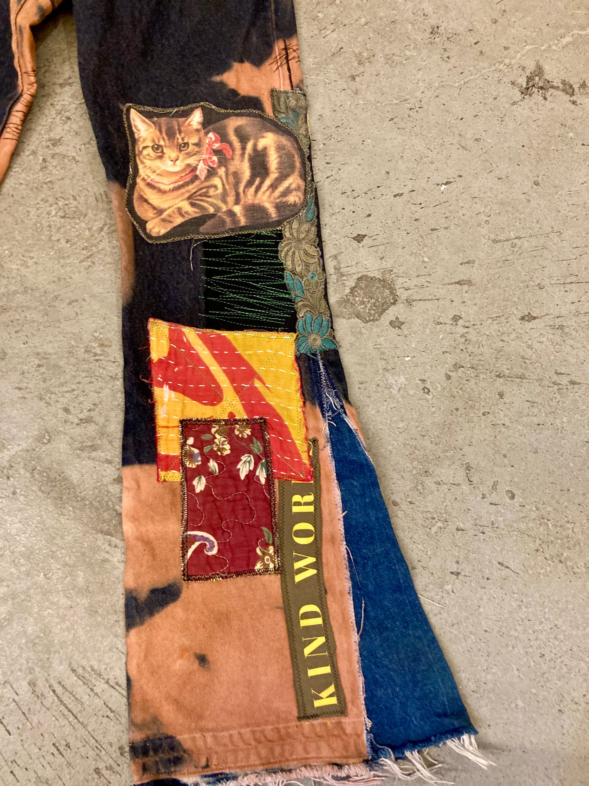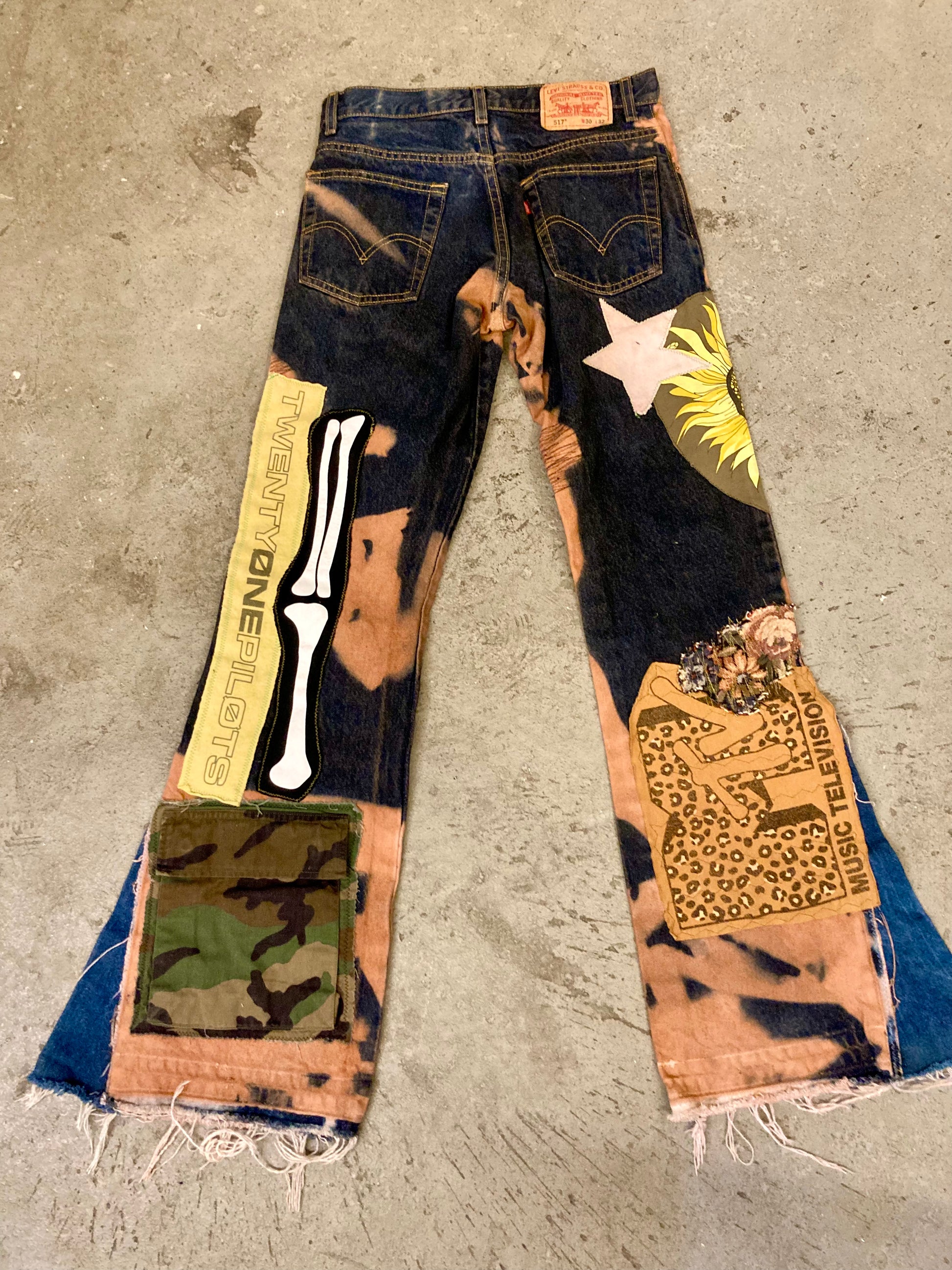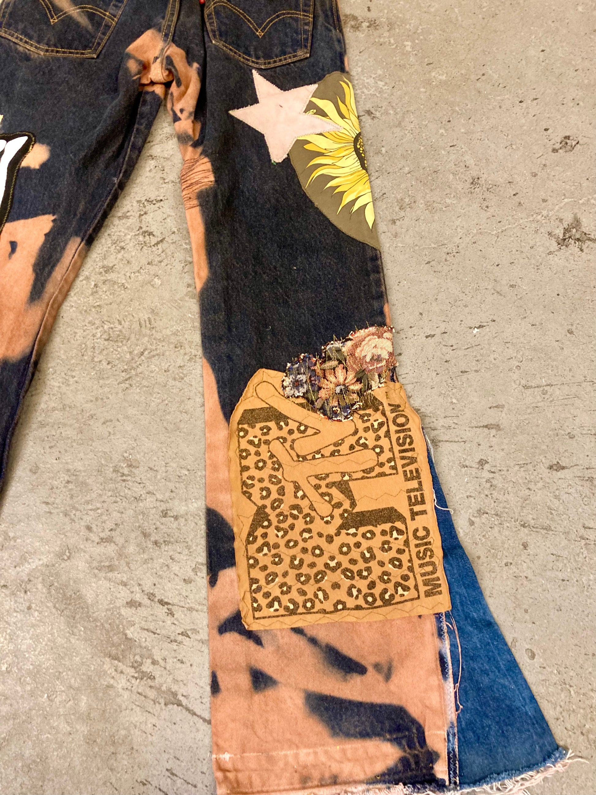 Custom tie dye effect, various patches, additional flared insert. One of One