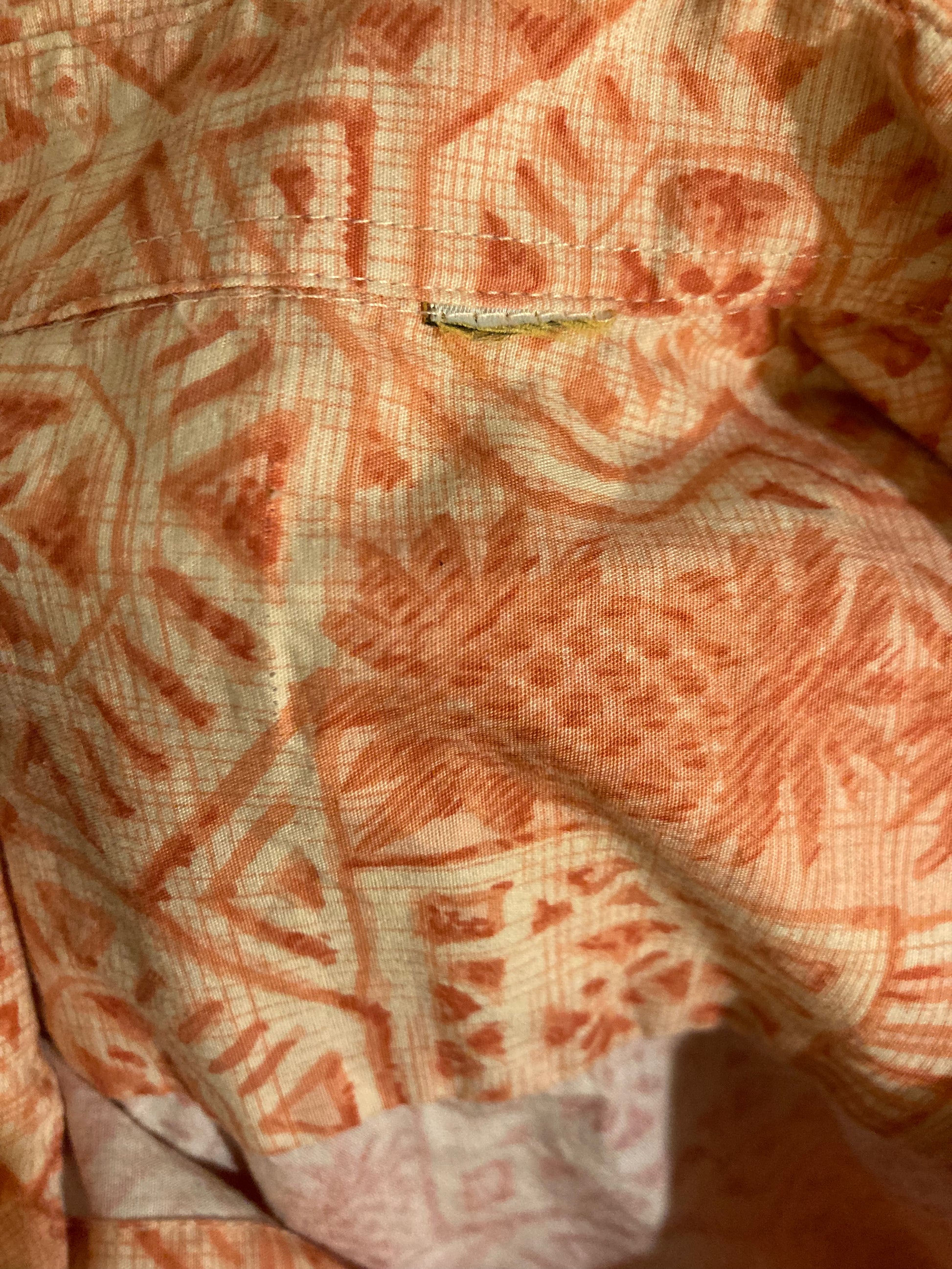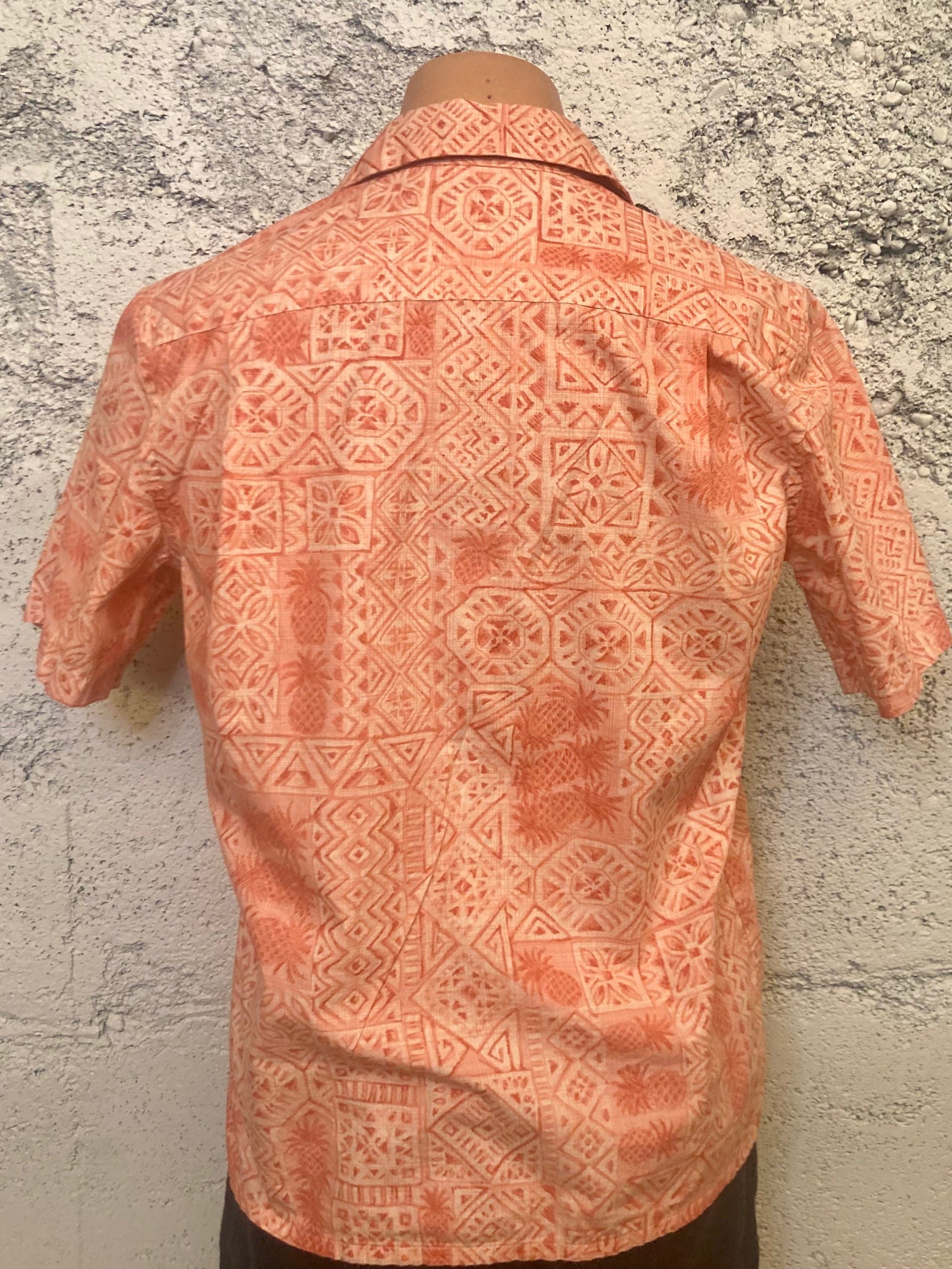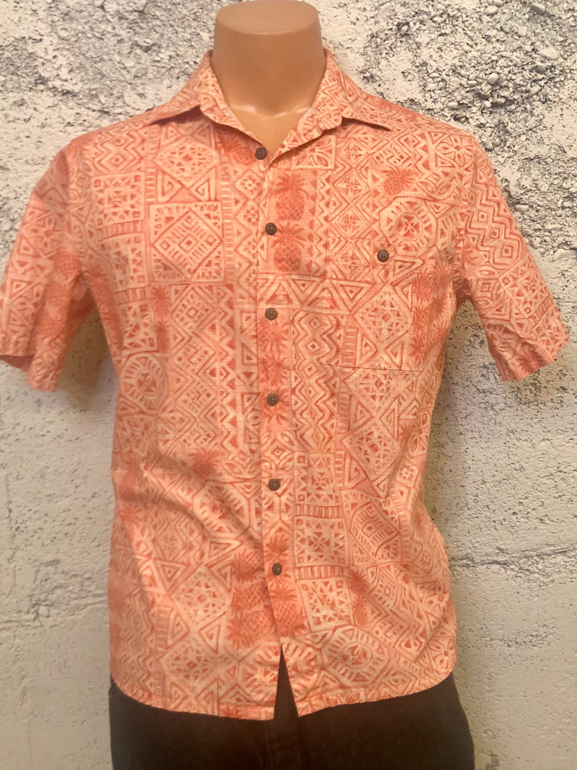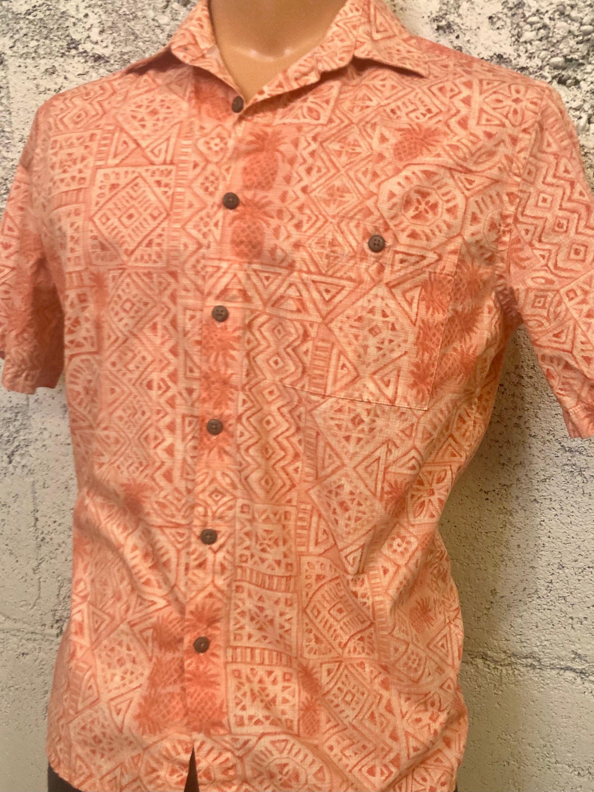 "Add a pop of color to your wardrobe with this vintage Hawaiian buttondown. In excellent condition, this unique piece features wooden buttons and no stretch for a classic fit. Perfect for a beach day or casual outing. (Wood you believe it?)"
