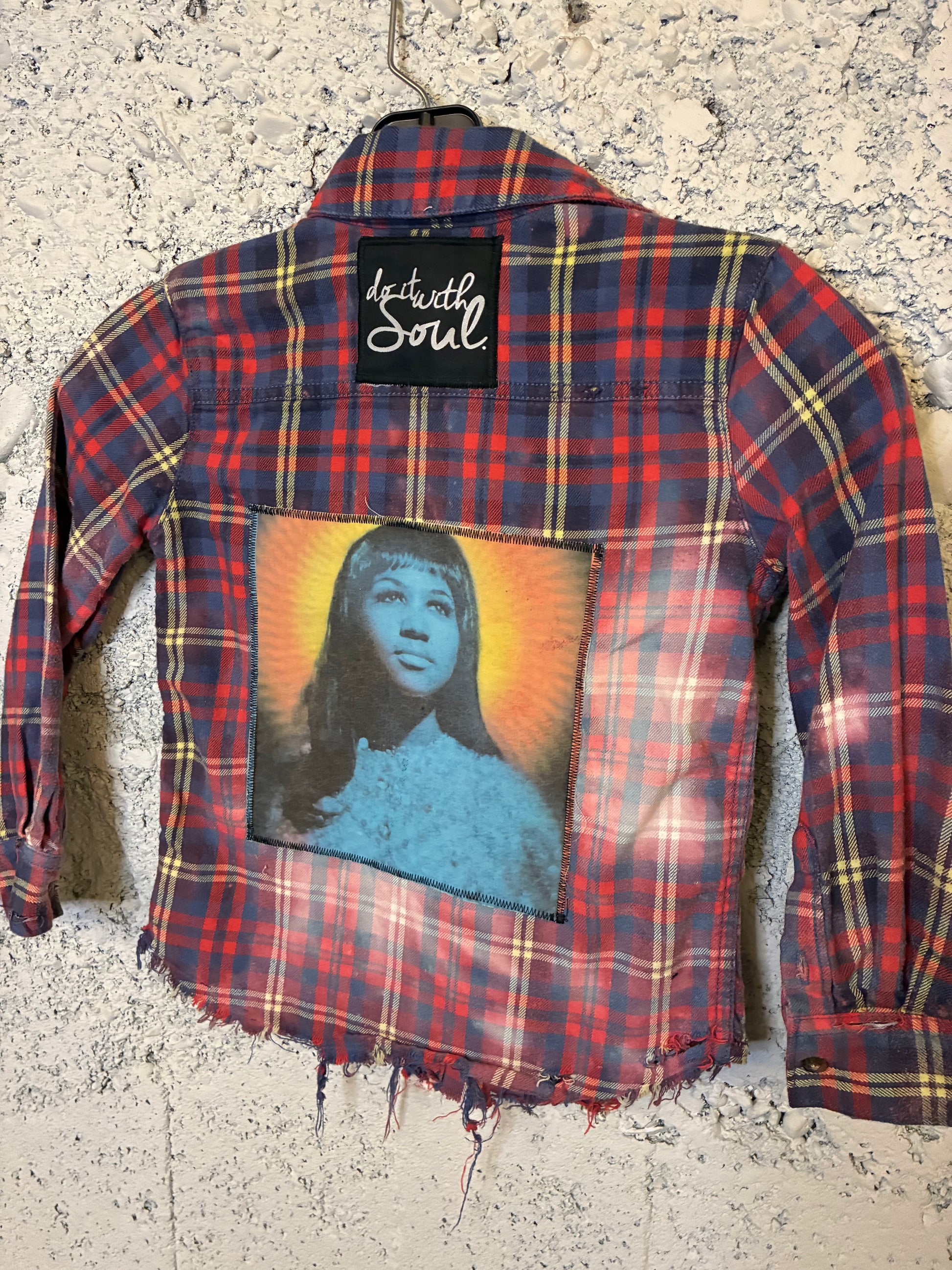 This one of a kind Youth Aretha Franklin Fan Flannel is a must-have for any fan. The red, blue, and yellow flannel features a unique sewn-on patch of the legendary Aretha Franklin. The purposely distressed and faded design adds a vintage touch to this stylish and comfortable flannel. A true collector's item for any Aretha Franklin lover.